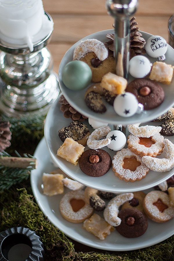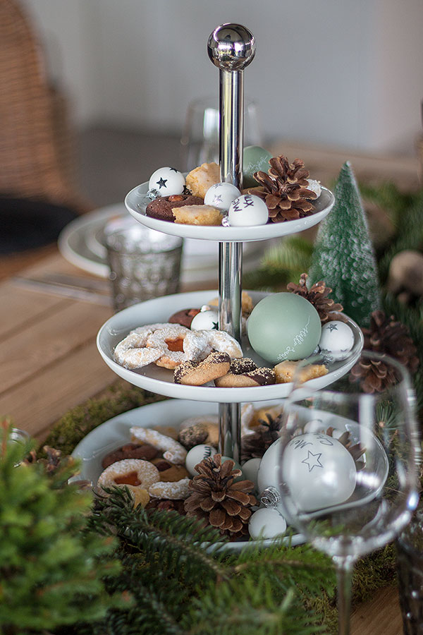 Habt ihr eure Lieben zum Adventskaffee eingeladen? Kein Problem! Auch dafür könnt ihr diese Weihnachtstischdeko mit Tanne verwenden. Die Etagere lässt sich anstatt mit Kugeln auch wunderbar mit selbst gebackenen Keksen bestücken. Ein paar wenige Kugeln und Zapfen lockern das Ganze auf. Alle Rezepte zu meinen Lieblingsplätzchen zu Weihnachten findet ihr auf Stylish Living. Da ist mit Sicherheit für jeden Geschmack etwas dabei.