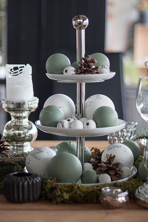 - In der Mitte des Tisches die Etagere platzieren und mit verschieden großen Kugeln sowie Zapfen bestücken.
