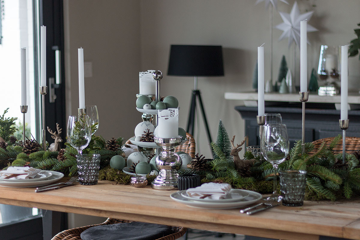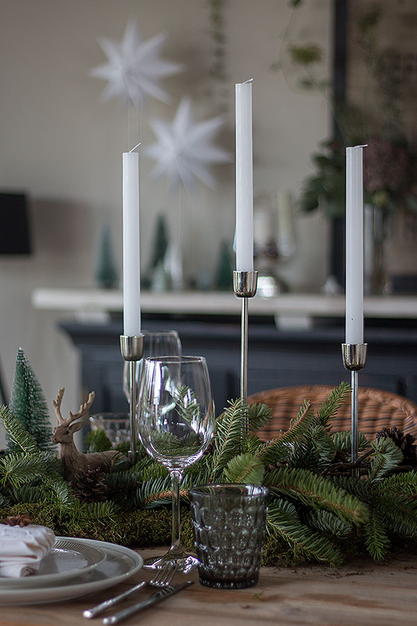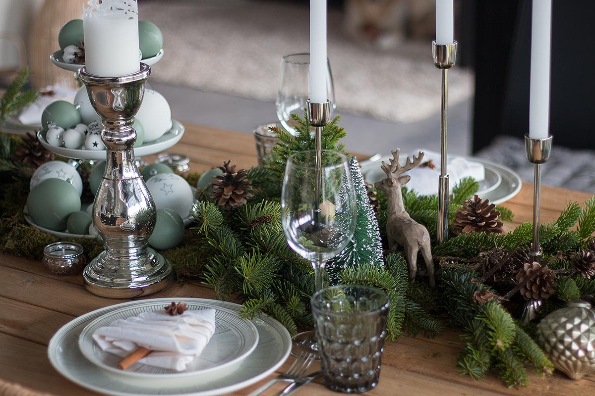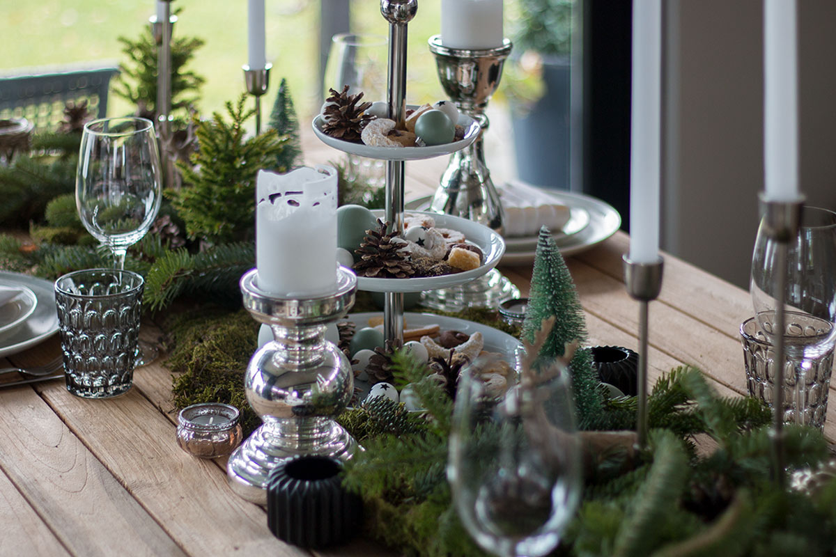 Am besten passt dazu ein rustikaler Holztisch. Ich habe extra für diesen Anlass den Teaktisch von der Terrasse nach drinnen geholt. Eine Tischdecke ist bei dieser Weihnachtstischdeko mit Tanne nicht nötig. In der Mitte des Tisches habe ich eine Etagere platziert und diese mit Weihnachtskugeln und Zapfen geschmückt. Dadurch bekommt die rustikale Deko einen modernen Touch. Die Zapfen wiederholen sich auf der Tanne. Dazu gesellen sich Dekotannenbäume sowie Dekohirsche. Silberfarbene Kerzenleuchter in unterschiedlichen Größen bringen Gemütlichkeit auf den Tisch.