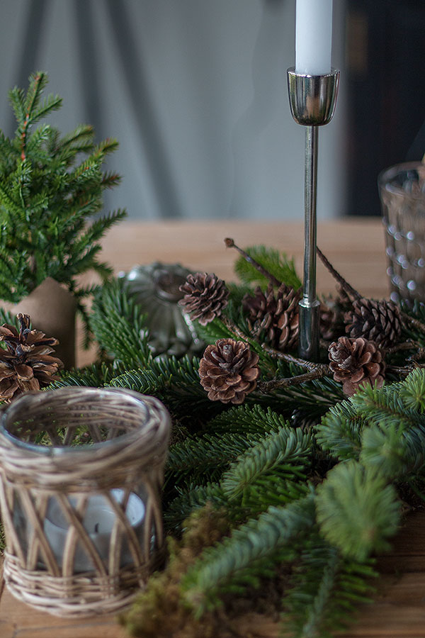 - Weihnachtstischdeko mit Tanne, Zapfen und Moos