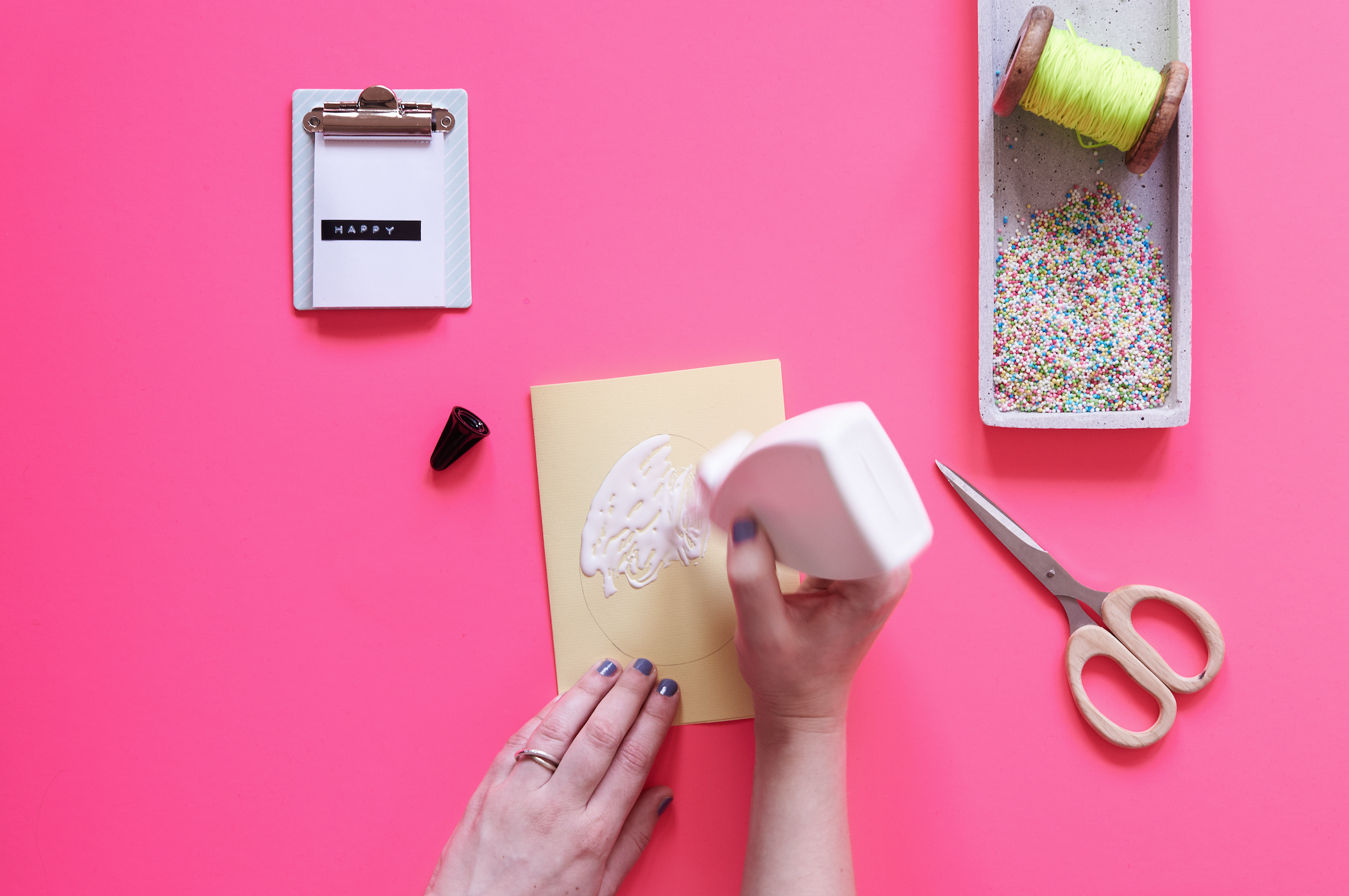 Jetzt kommen unsere Zuckerperlen zum Einsatz. Riesel sie vorsichtig direkt ins Klebstoffbett und drücke sie im Anschluss vorsichtig fest.