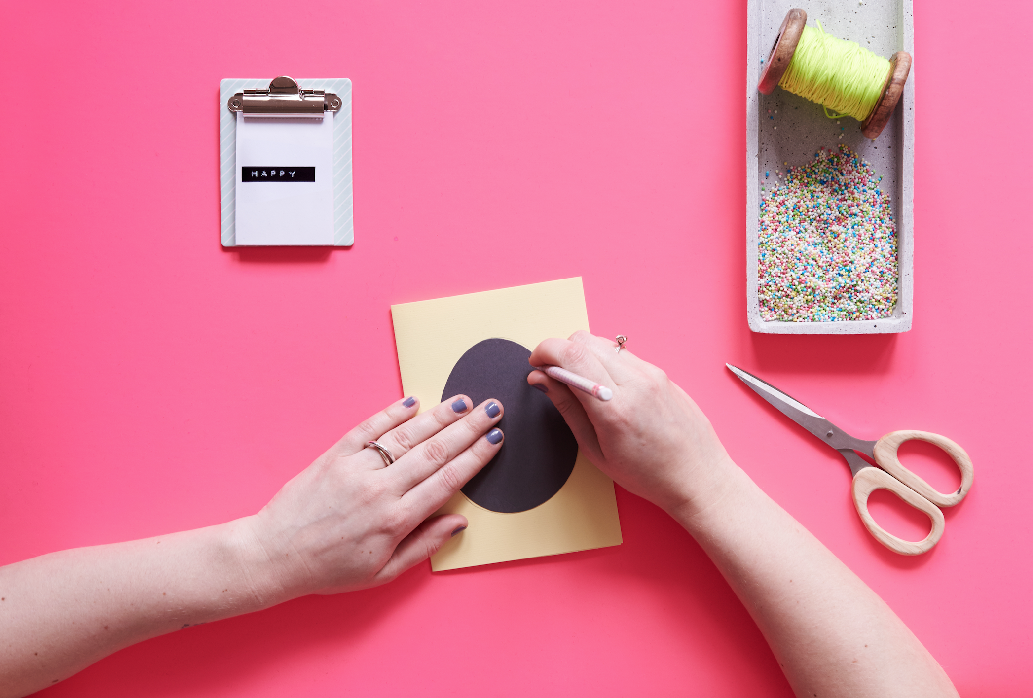 Wir starten mit der Pappe! Zunächst malen wir uns ein Ei auf ein Stücke Pappe oder Papier und schneiden es aus. Dies ist unsere Vorlage, mit der wir nun im handumdrehen die Ei-Umrisse auf alle Postkarten übertragen können. Mein Tipp: Schneidet das Ei im oberen Drittel auseinander, so sieht es aus, als wäre es gerade aufgebrochen.