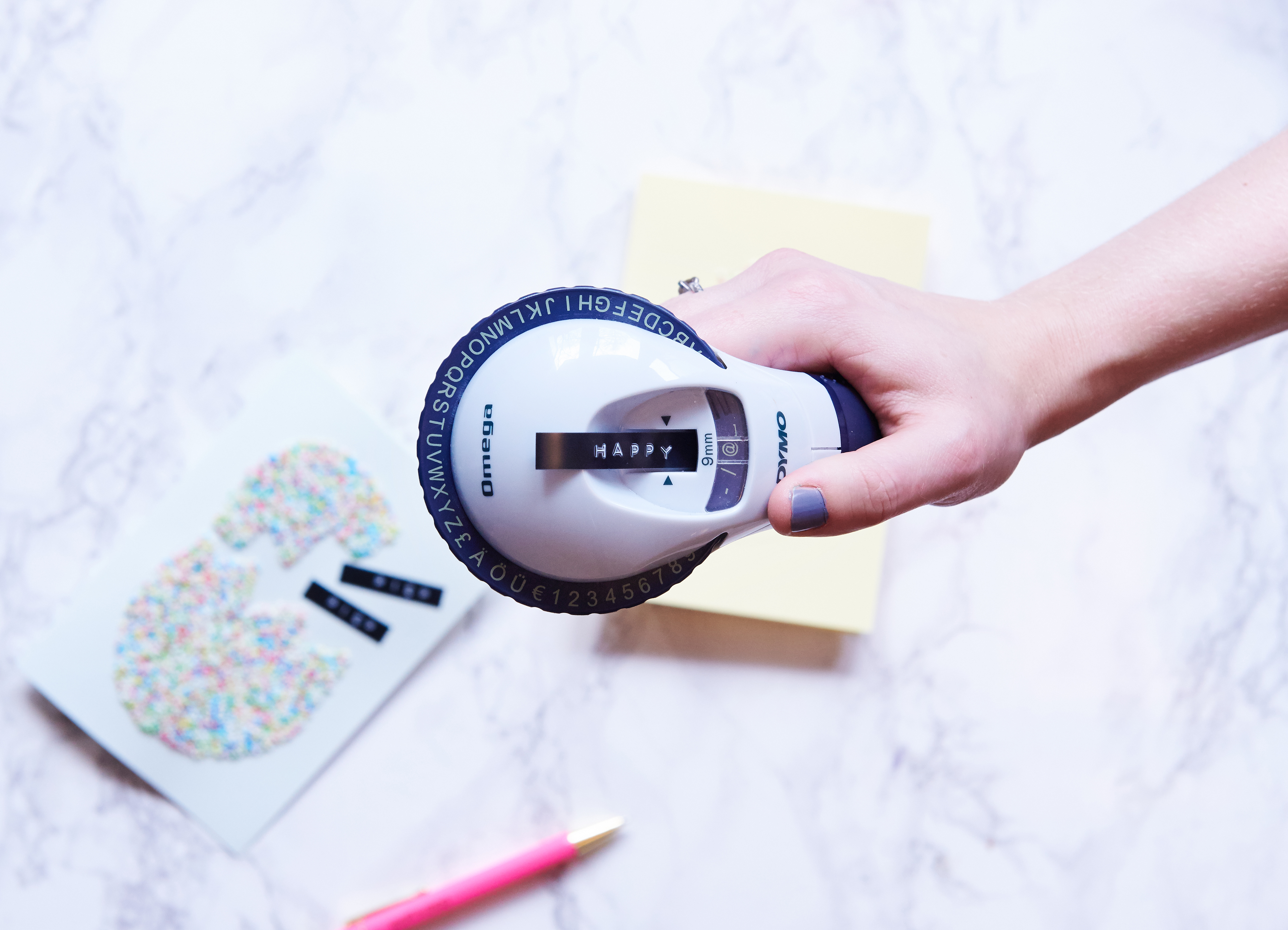 Zum Schluss fehlt nur noch ein kleiner Gruß. Ich habe mir dafür einen Labelmaker besorgt. Dieser funktioniert ganz easy. Einfach den gewünschten Buchstaben oben am Rädchen einstellen und dann am Griff fest zudrücken. Auf diese Weise stanzt sich das Wort nach und nach in das schwarze, selbstklebende Band. Übrigens, die Bänder gibt es auch in den Farben Rot und Blau.