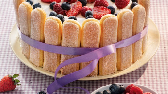 Einen Tortenring (20 cm Ø) auf eine Tortenplatte stellen. Die Löffelbiskuits am Rand des Rings herum aufstellen. Die Creme in die Mitte geben und alles im Kühlschrank mindestens 4 Stunden fest werden lassen.
