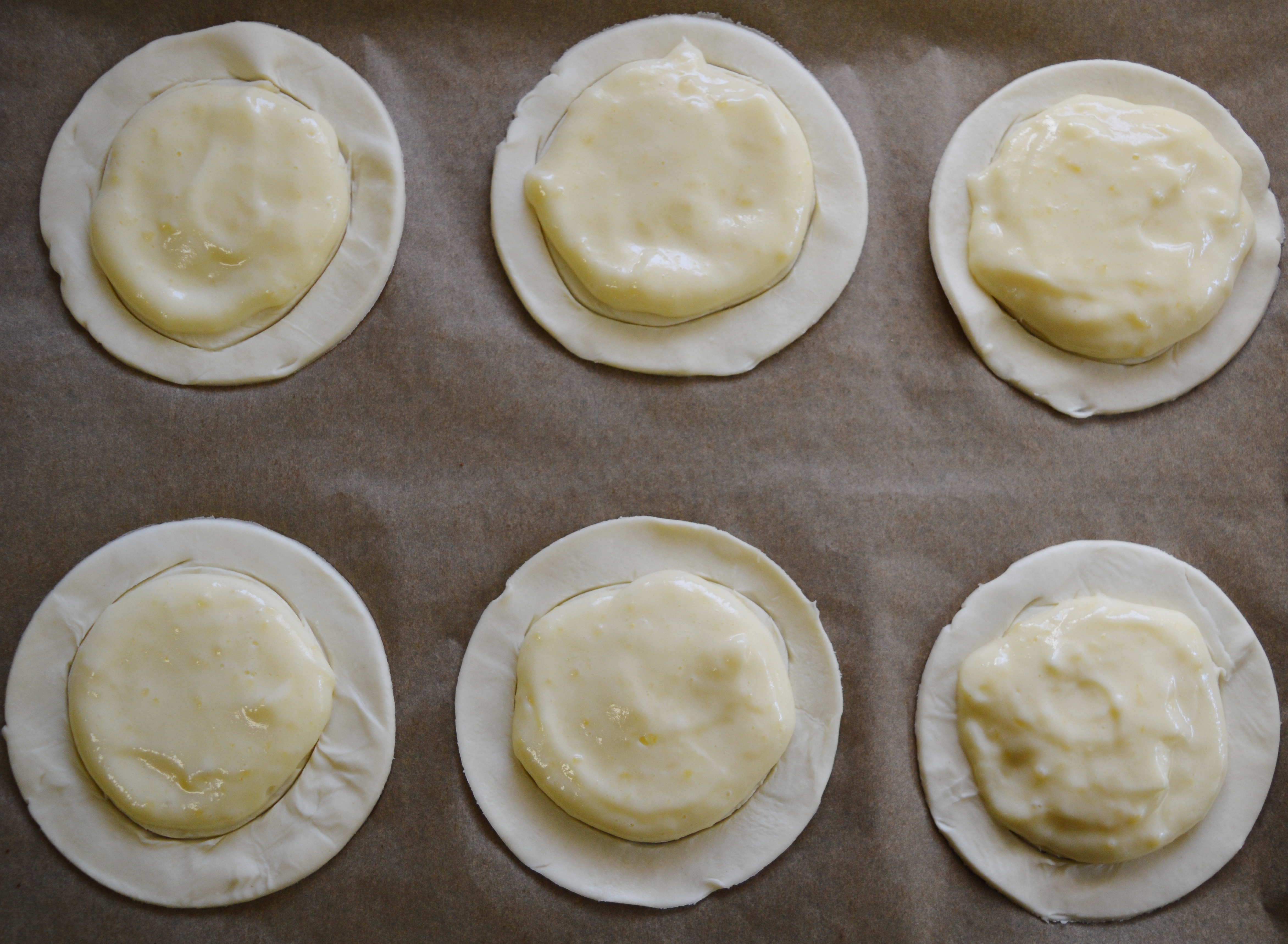4. Die Puddingcreme nach Packungsanleitung mit Milch anrühren. Auf jedes Blätterteig-Teilchen ungefähr 2 Teelöffel der Creme verteilen. Den Rand aussparen.