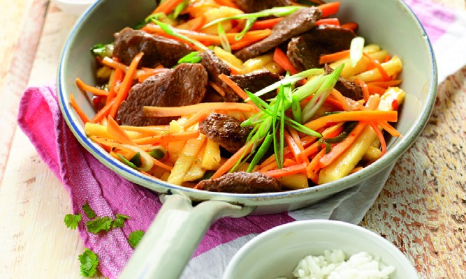 Den Duftreis nach Packungsangabe in Salzwasser garen. Möhren putzen, schälen und in dünne Streifen schneiden. Ananas schälen und putzen. Erst in Scheiben, dann in Streifen schneiden, dabei das harte Mittelstück entfernen. Knoblauch schälen und fein hacken. Die Frühlingszwiebeln waschen, putzen und die weißen und hellgrünen Teile in feine Scheiben schneiden. Entenbrüste waschen, trocken tupfen, quer zur Faserrichtung in etwa 0,5 cm breite Streifen schneiden und mit Salz und Pfeffer würzen. Das Öl in einer Pfanne erhitzen. Das Fleisch dazugeben und portionsweise 1–2 Minuten anbraten. Zum Schluss das gesamte Fleisch zurück in die Pfanne geben. Frühlingszwiebeln, Möhren, Ananas und Knoblauch dazugeben und ca. 3 Minuten weiterbraten. Gemüsebrühe,