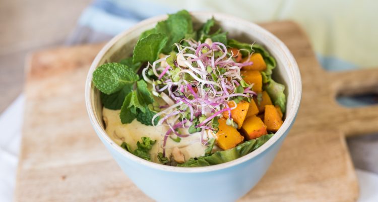 Zuerst gebt ihr den Salat in eine Schüssel und darauf 3-4 EL gekochten Quinoa. Anschließend schichtet ihr die Kürbiswürfel, gehackte Lauchzwiebel und Sprossen darauf. Besonders schön sieht es aus, wenn ihr für jedes Gemüse ein eigenes „Eckchen“ in der Schüssel findet, sodass man die Zutaten erst beim Essen vermischt.