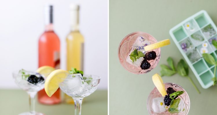 Wenn die Eiswürfel durchgefroren sind, die Cocktails vorbereiten! Zuerst die Brombeeren abwaschen, die Zitronen in Scheiben schneiden und beiseite stellen. Für die Cocktails dann den gekühlten Rosé zur Hälfte ins Glas füllen, mit Soda aufspritzen und einen Schuss Hollunderblütensirup hinzufügen. TIPP: wenn man den Sirup langsam am inneren Rand des Glases entlanglaufen lässt, fließt der Sirup nach unten und setzt sich am Glasgrund ab. Bei färbigen Verdünnsäften sieht das dann ein wenig wie ein Farbverlauf aus und ihr habt ein Cocktail im Ombre-Look! Je dunkler jedoch die Farbe des Sirups, umso schlechter sieht man dann allerdings das Eiswürfel-Blüten-Highlight. Daher habe ich Hollunderblüten & Rosé gewählt.