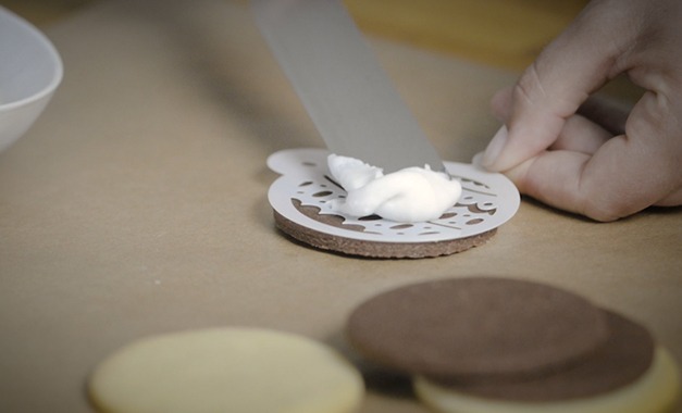 Dafür legt ihr die Schablonen entsprechend der Plätzchenformen auf und streicht mit Hilfe der Winkelpalette die Glasur eurer Wahl über die Schablone auf die Plätzchen. Eine kleine Menge genügt, um die gesamte Fläche zu füllen. Vorsichtig abheben und fertig! Jetzt heißt es nur noch Geduld haben, bis die Glasur getrocknet ist und dann ab auf den Teller :)