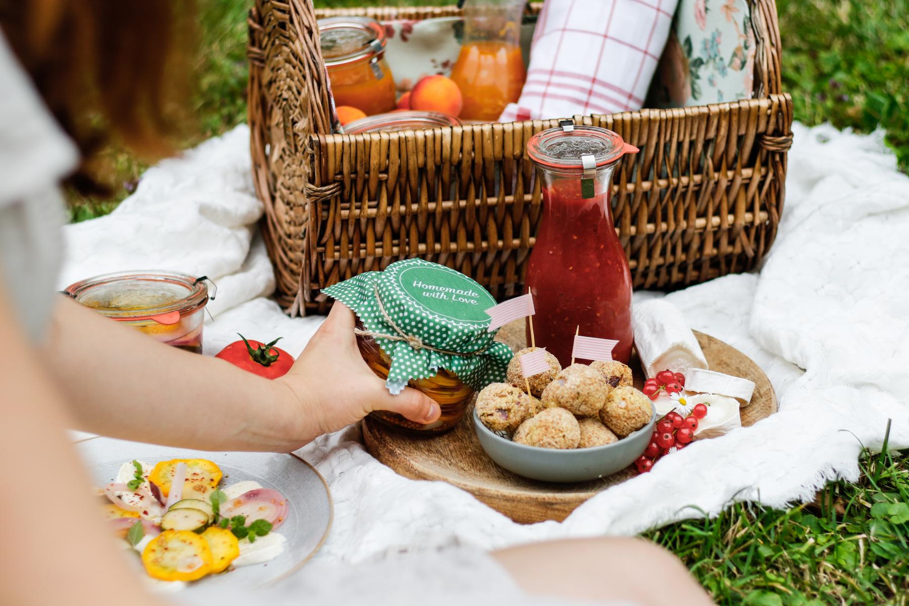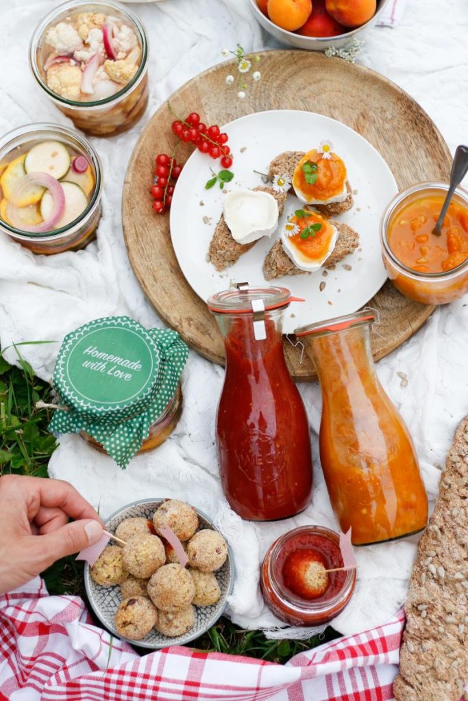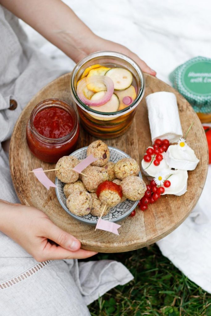 Diese gesunden Bällchen schmecken Groß & Klein. Ich bereite sie super gerne für Picknickdates oder auch einfach mal so für die ganze Woche vor. Kombiniert mit selbstgemachten Einkoch-Highlights zum Dippen – ein leckerer Snack für alle Lebenslagen.