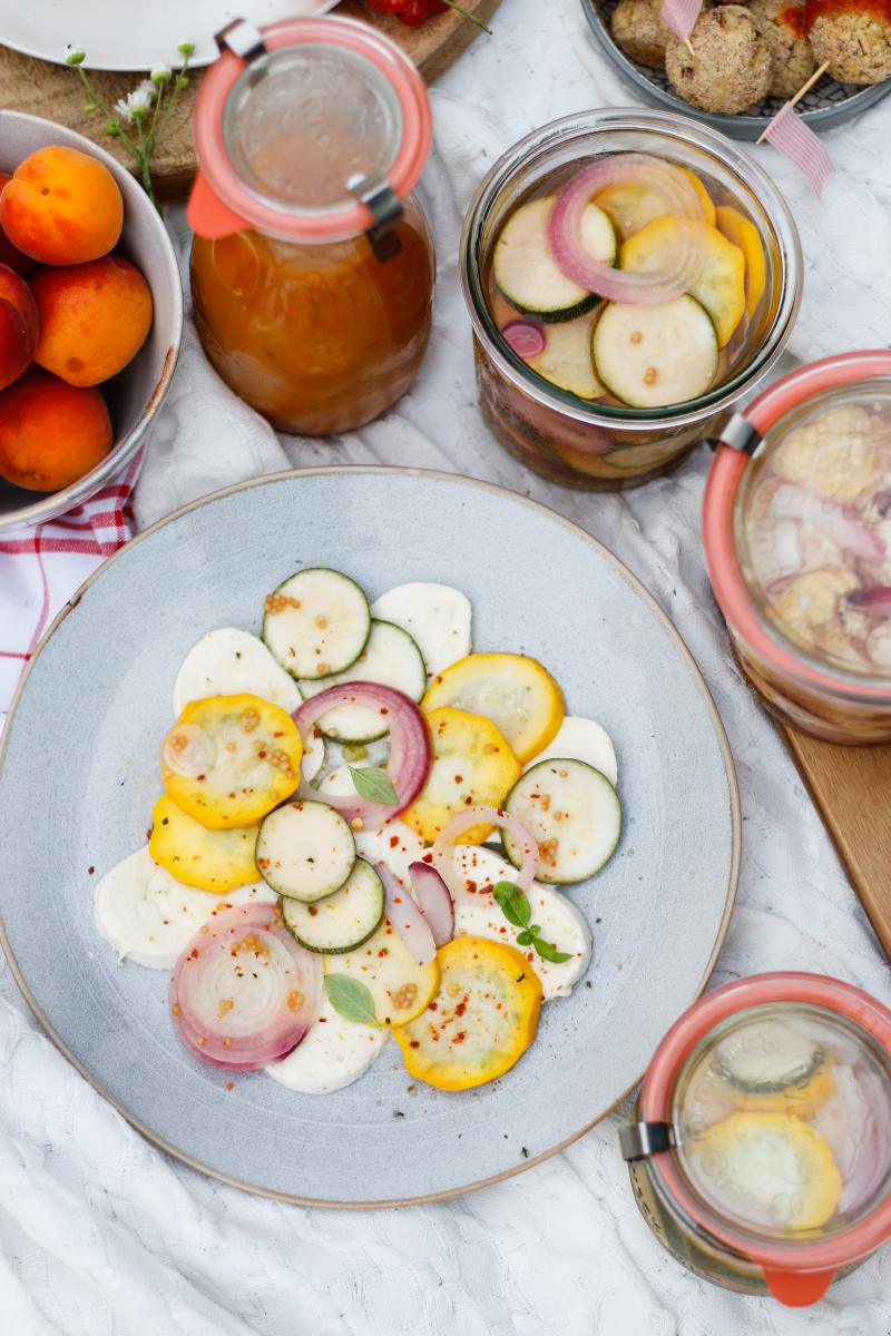 Dafür einfach eine Mozzarellakugel in Scheiben schneiden und mit dem eingelegten Gemüse hübsch auf einem Teller anrichten. Nach Belieben mit etwas Olivenöl beträufeln, mit etwas Salz und grobem Pfeffer (oder auch Chiliflocken) bestreut servieren. Ein perfektes und so simples Sommeressen.