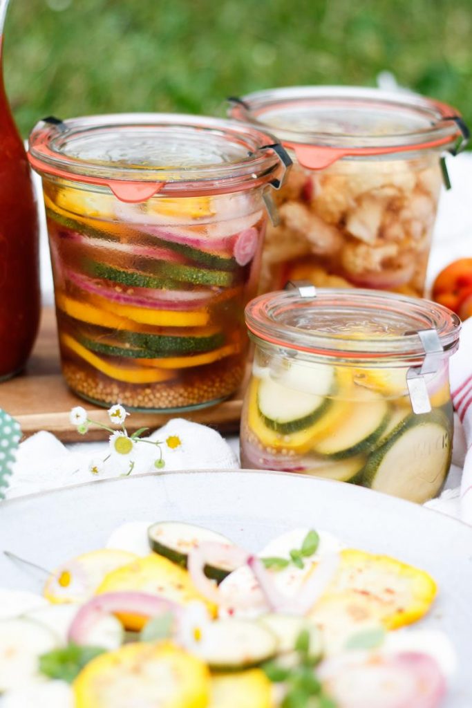 Auf zum nächsten Rezept zum Einkochen: Es geht einfach nichts über süß saures, selbst eingelegtes Sommergemüse. Damit dieses aber auch wirklich gut gelingt, sollte man beim Essig unbedingt auf Qualität achten. Meine Lieblingskombinationen sind bunte Zucchinischeiben mit roten Zwiebelringen und Blumenkohlröschen.