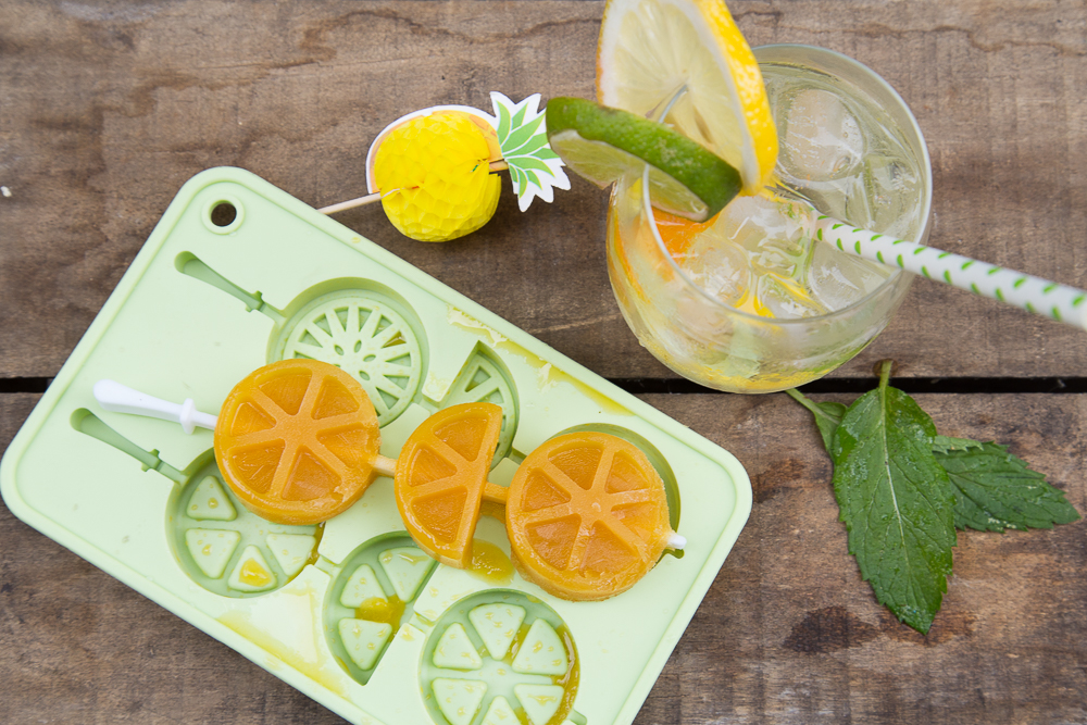 Statt mit Wasser kann man leckere Eiswürfel aus Fruchtsaft (Eiswürfelbereiter Lemon von DEPOT) machen und diese mit ins Wasser oder Getränkeglas geben. So wird Wasser alles andere als langweilig.