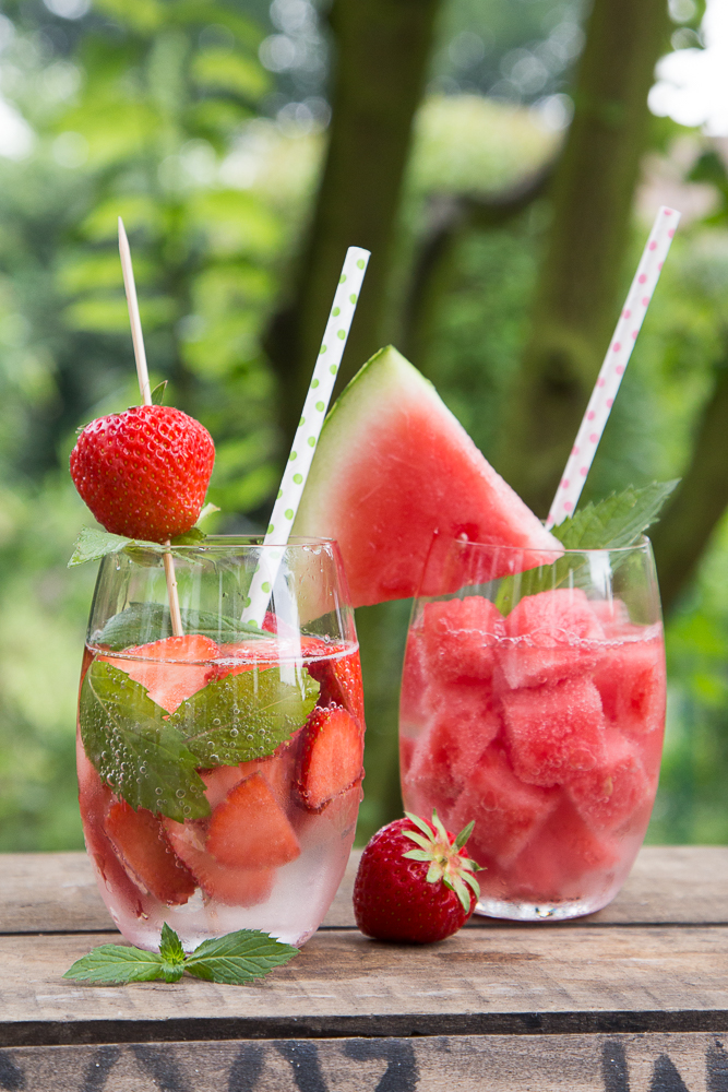 Erfrischung im Glas. Friert doch ein paar klein geschnittene Melonenstückchen oder Erdbeeren ein und verwendet sie später als Eiswürfel. Ein wenig Cocos-Wasser und Minze runden das Ganze ab.