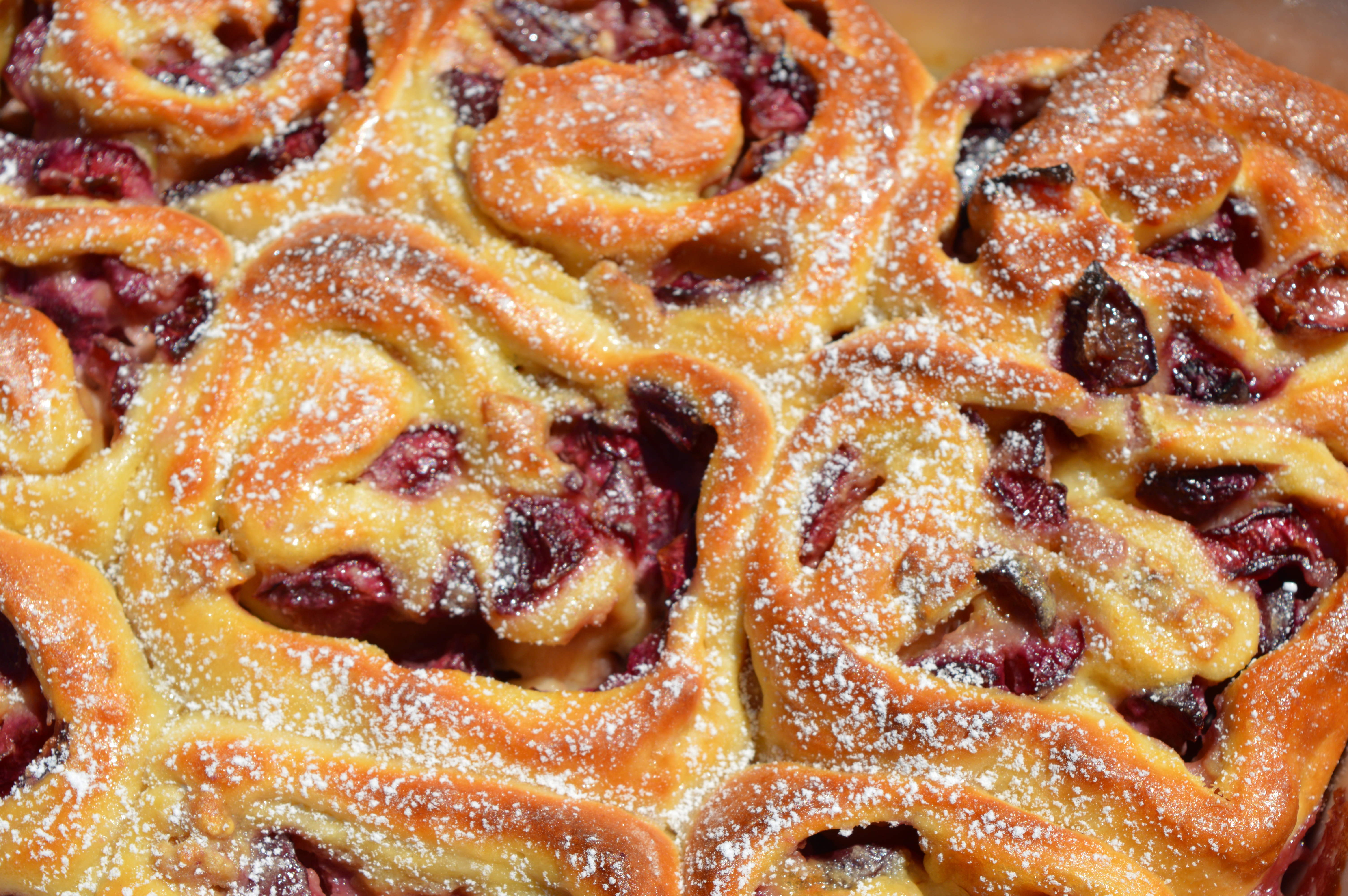 8. Den Teig auf einer bemehlten Arbeitsflächte rechteckig ausrollen. Die Puddingcreme auf den Hefeteig geben und mit Kirschen und Walnüssen bestreuen. Dabei einen kleinen Rand frei lassen, damit die Masse beim Aufrollen nicht herausquillt.