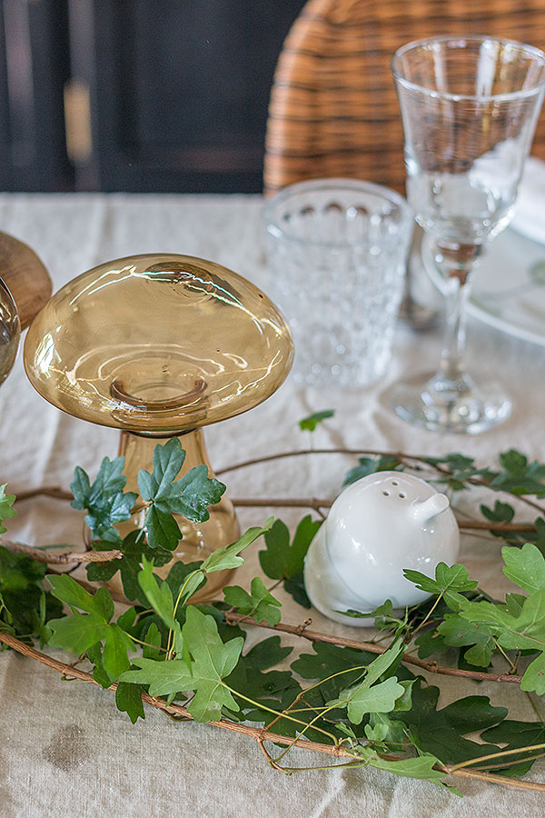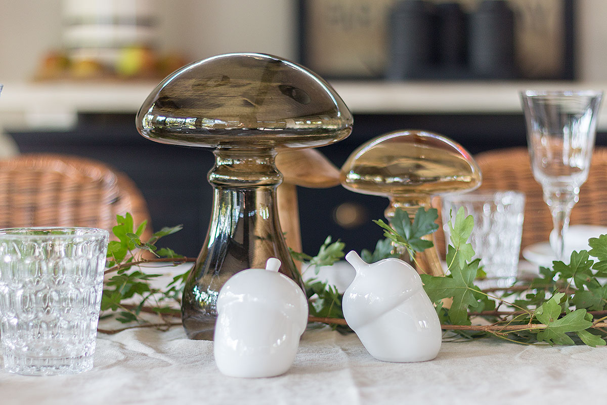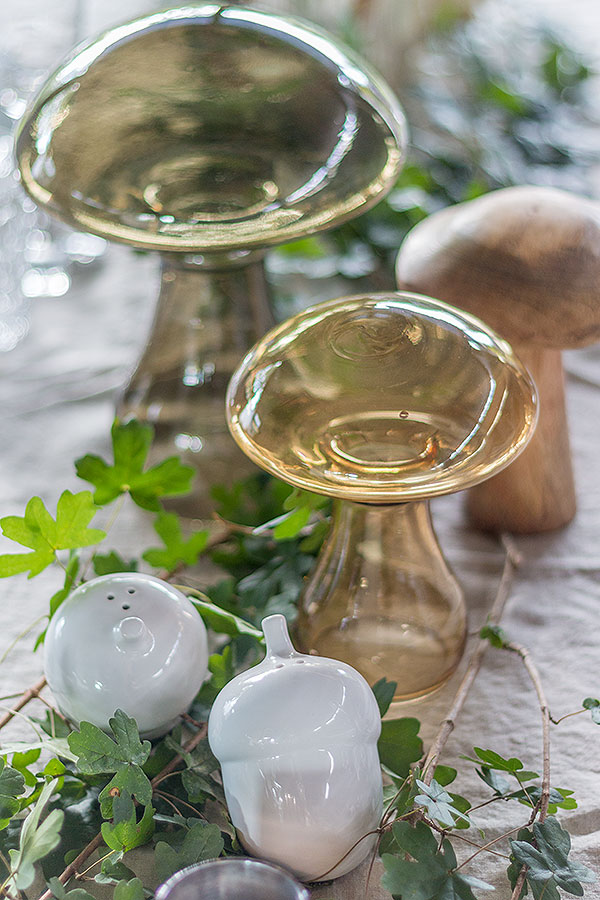 Ich fand die Form dieser Blätter hier ganz toll. Hat einer von Euch vielleicht eine Idee, von welchem Baum sie stammen? Ich meine mich erinnern zu können, dass rote Beeren an dem Baum, oder eher Strauch, hingen. Eine tolle Ergänzung zu dem Grün sind diese zauberhaften Dekopilze von DEPOT. Diese gibt es in verschiedenen Größen, Farben und Materialien. Das Zusammenspiel aus Glas & Holz gefällt mir besonders gut. Und sind diese Porzellan Salz- und Pfefferstreuer in Eichelform nicht herzallerliebst?!