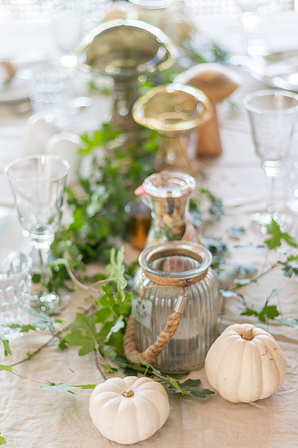 - Herbsttischdeko mit weißen Kürbissen