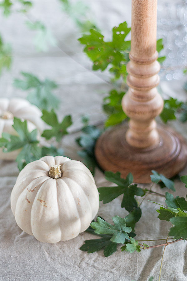- weiße Zierkürbisse und Blätter als Tischdeko