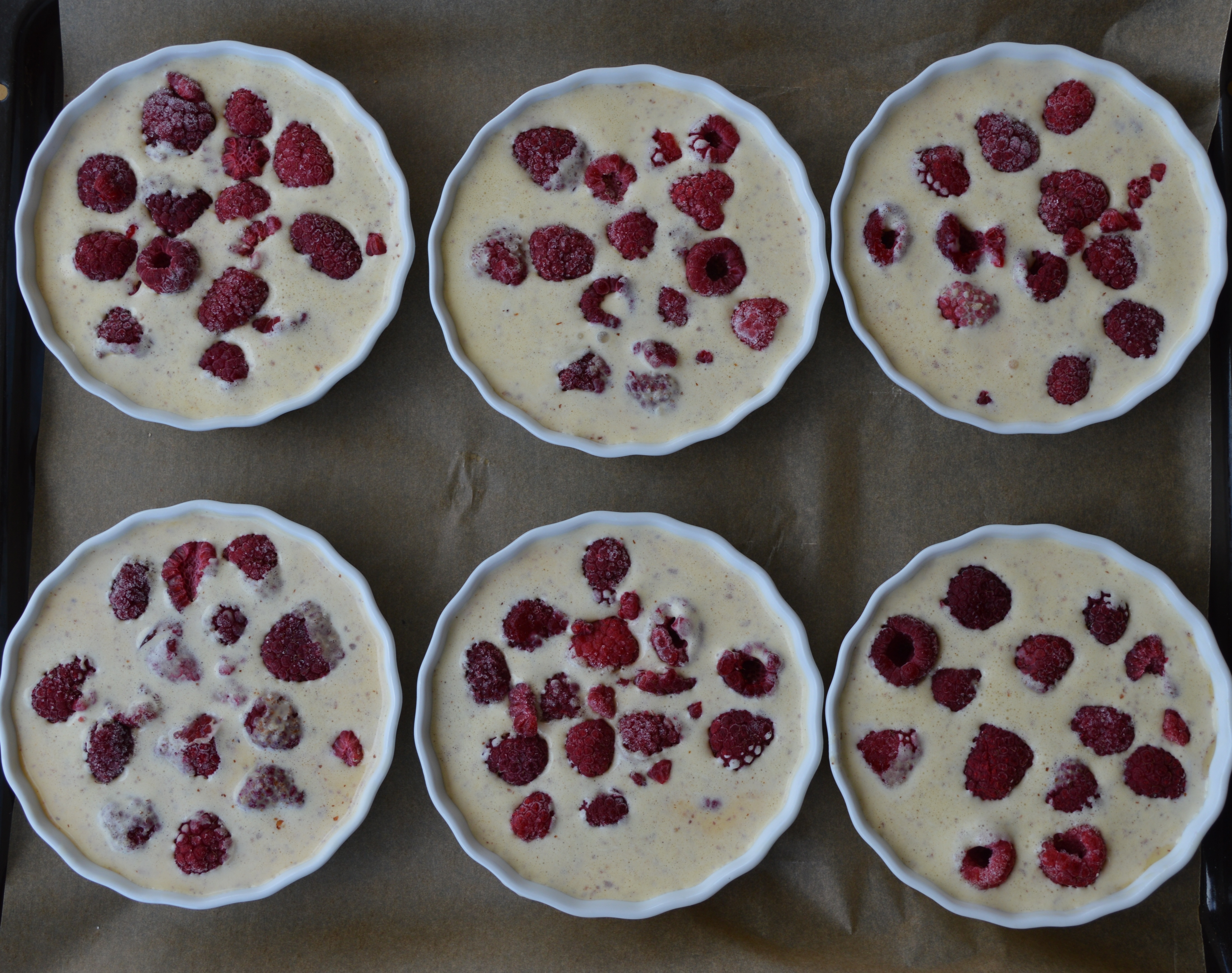 3. Den Teig jetzt auf alle sechs Förmchen verteilen. Zum Schluss in jedes Förmchen ungefähr gleich viele Himbeeren geben und die Clafoutis für ca. 20-25 Minuten in den vorgeheizten Backofen schieben.