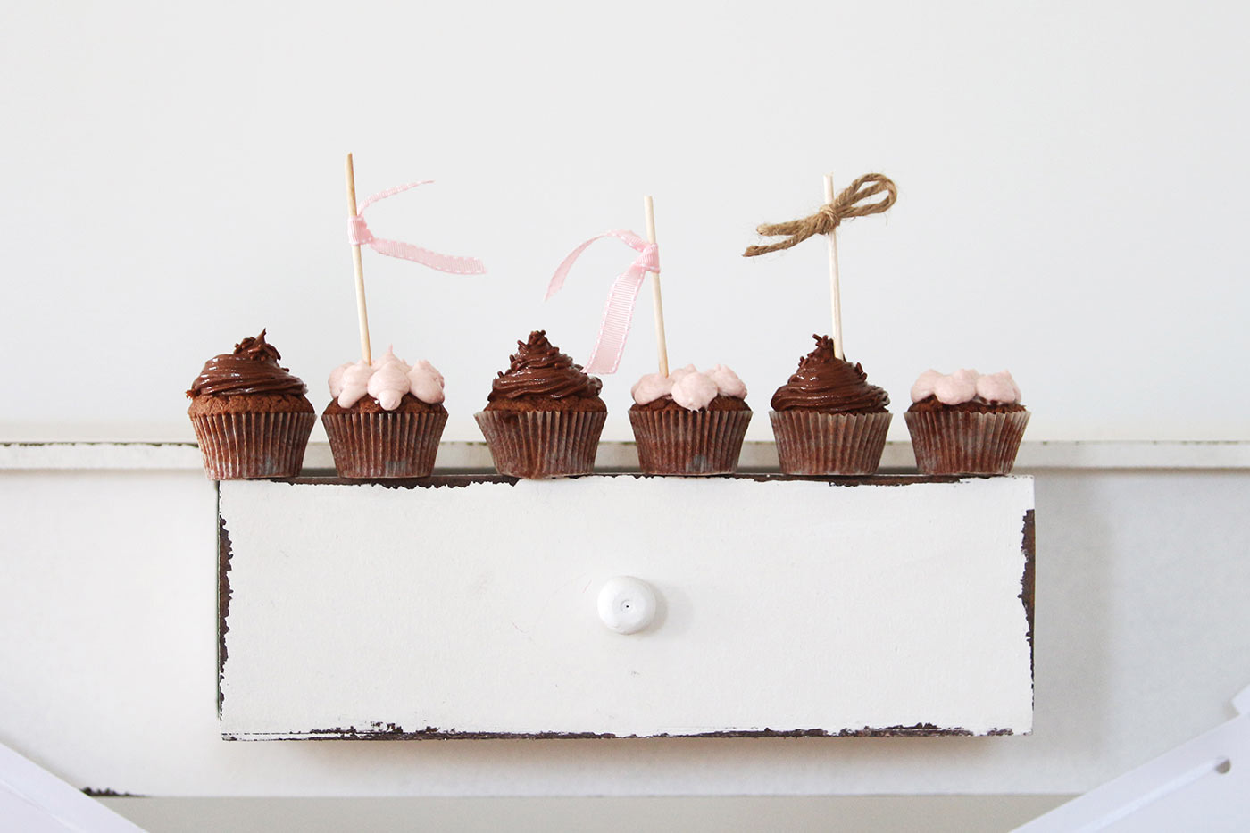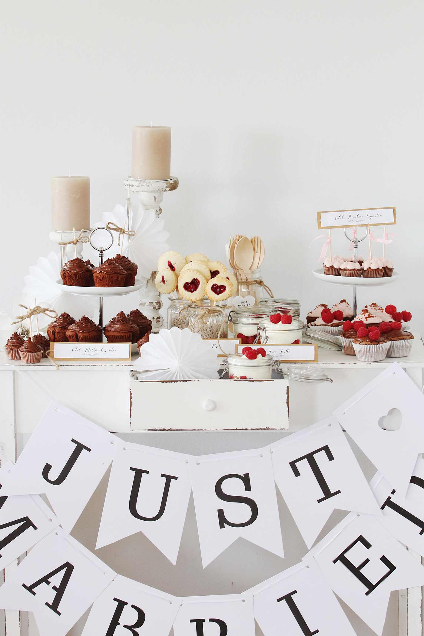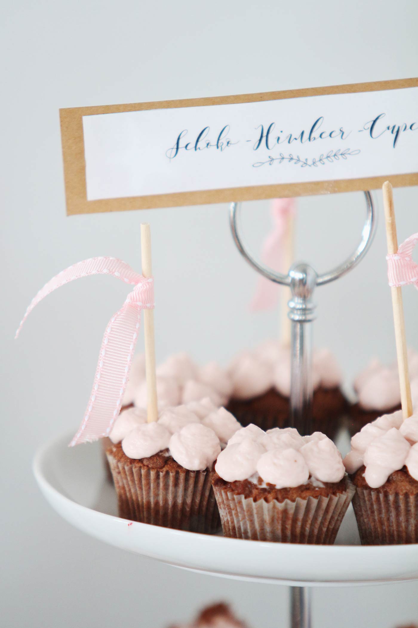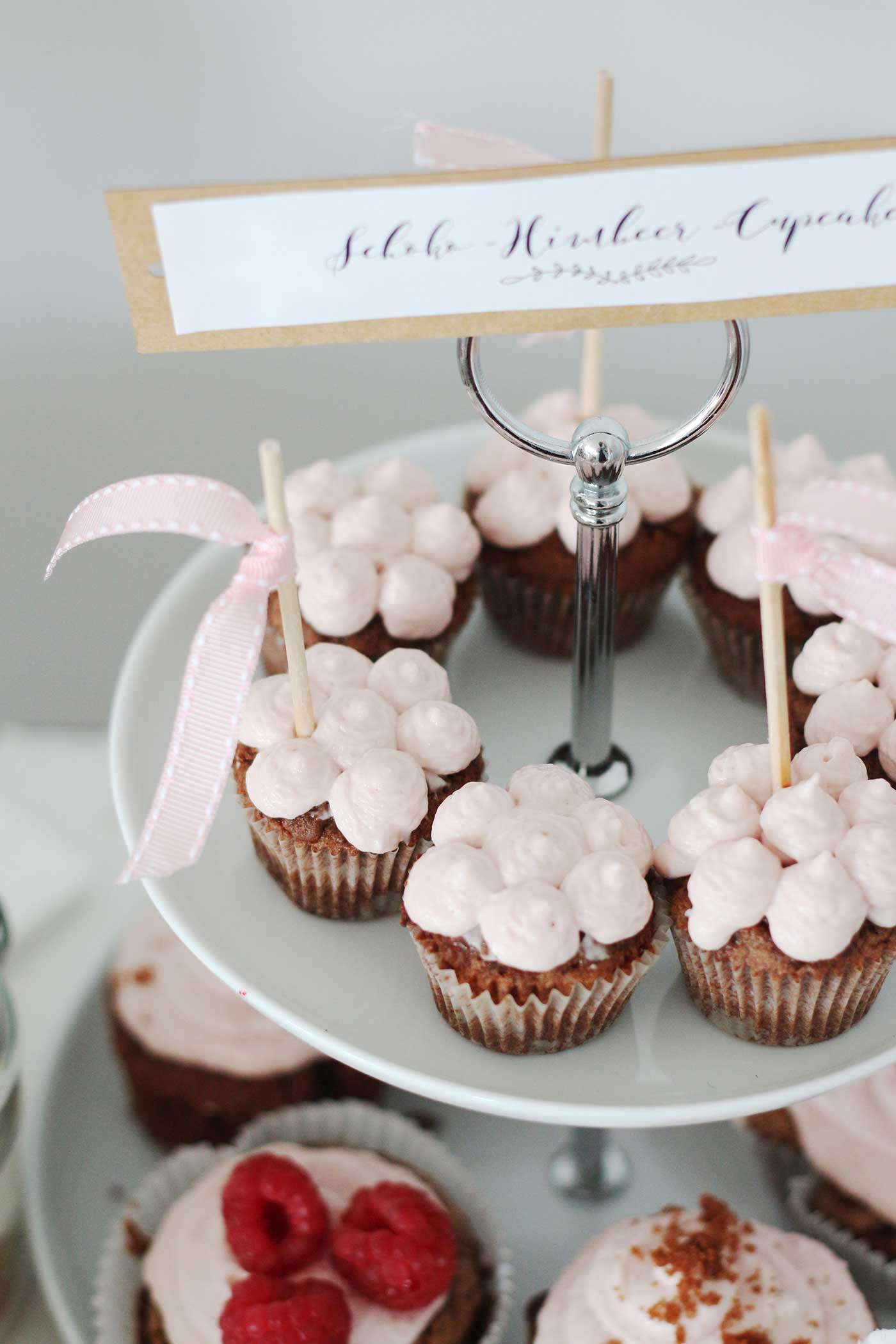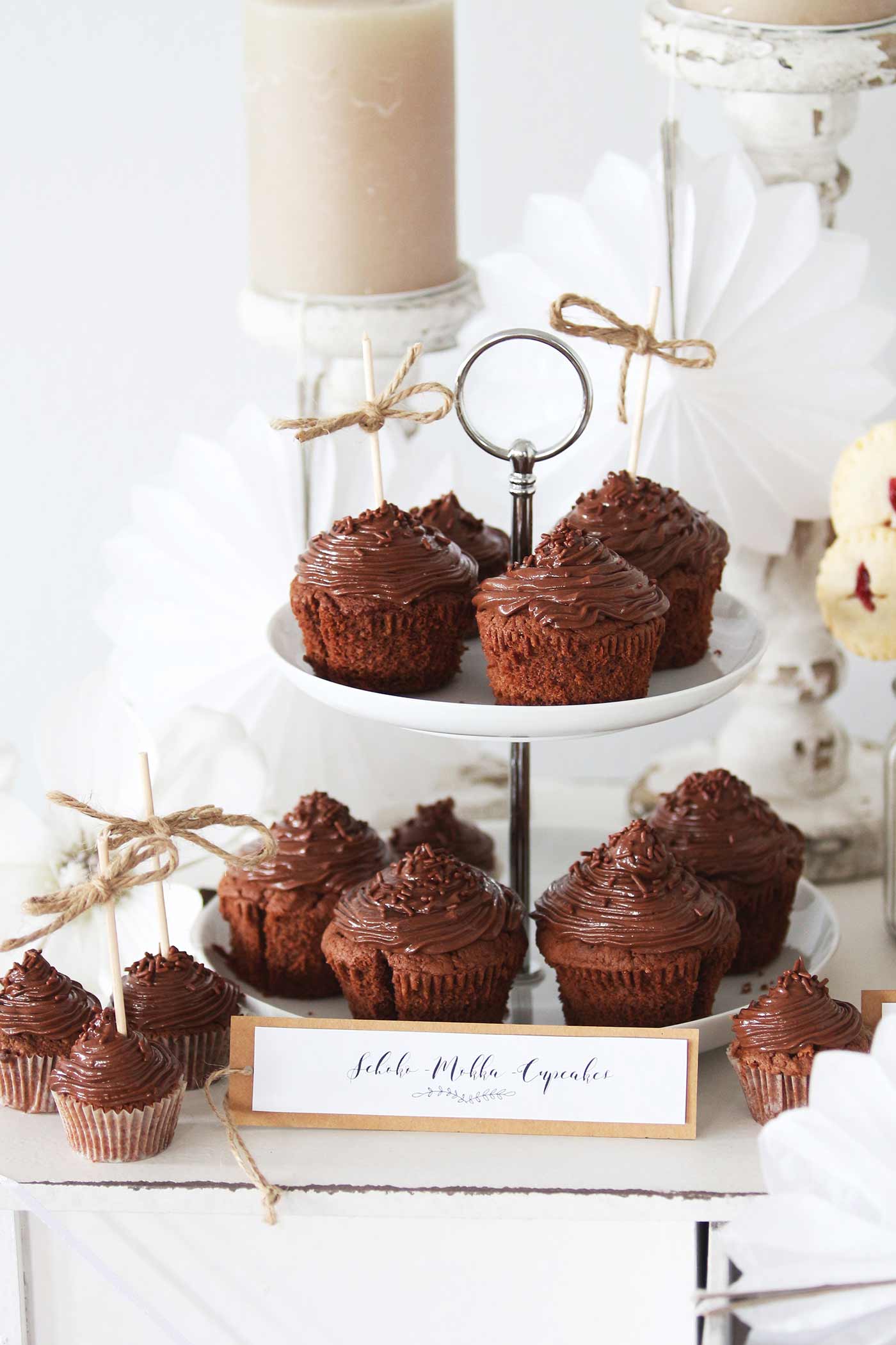 Natürlich braucht ihr, wenn ihr eure Süßigkeiten schön anrichten wollt, auch die passenden Behälter und Accessoires. Etageren sind sehr hübsch und praktisch, um etwa Cupcakes anzurichten. Diese könnt ihr wiederum mit kleinen Holzspießen und Schleifen oder Fähnchen aus Geschenkbändern zuckersüß aufpimpen. Da wir Cupcakes absolut lieben, haben wir gleich unterschiedliche Varianten auf unserem Sweet Table. Der Grundteig ist bei allen gleich – nur das Topping variiert. Wir haben uns einmal für ein dunkles Schoko-Mokka-Buttercreme-Topping und einmal für ein rosafarbenes Himbeer-Frischkäse-Topping entschieden.