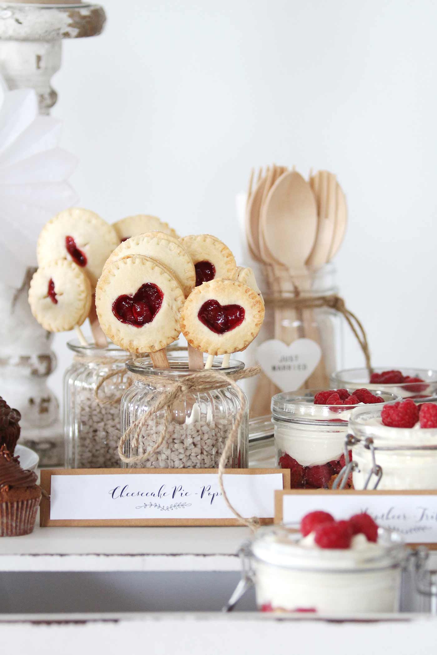 Auf unserem Sweet Table findet ihr außerdem Cheesecake Pie-Pops, also kleine Käsekuchen auf einem Eis- oder Lolli-Stiel . Um sie zu präsentieren, haben wir sie in kleine Windlichter gesteckt, die wir mit Deko-Steinchen, farblich abgestimmt zur restlichen Deko, befüllt haben. So sehen sie nicht nur zum Anbeißen aus, sondern fallen auch nicht um. Auch Cake Pops können so hübsch angerichtet werden.