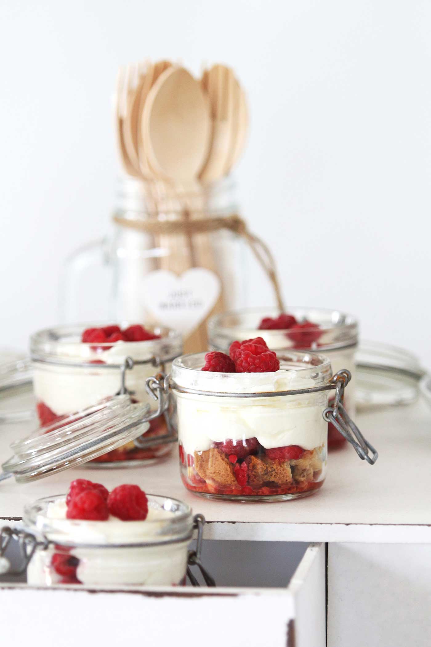 Unser süßes Quartett rundet außerdem ein Schicht-Dessert im Glas ab. Wenn ihr etwa Einmachgläschen oder ein Glas mit Bügelverschluss verwendet, lässt es sich gut verschließen und ihr könnt es ohne Probleme auch draußen im Freien stehen lassen. Unser Himbeer-Trifle (etwa vier kleine Gläschen) besteht aus einer Quark-Mascarpone-Creme, gefrorenen Himbeeren und Cantuccini.