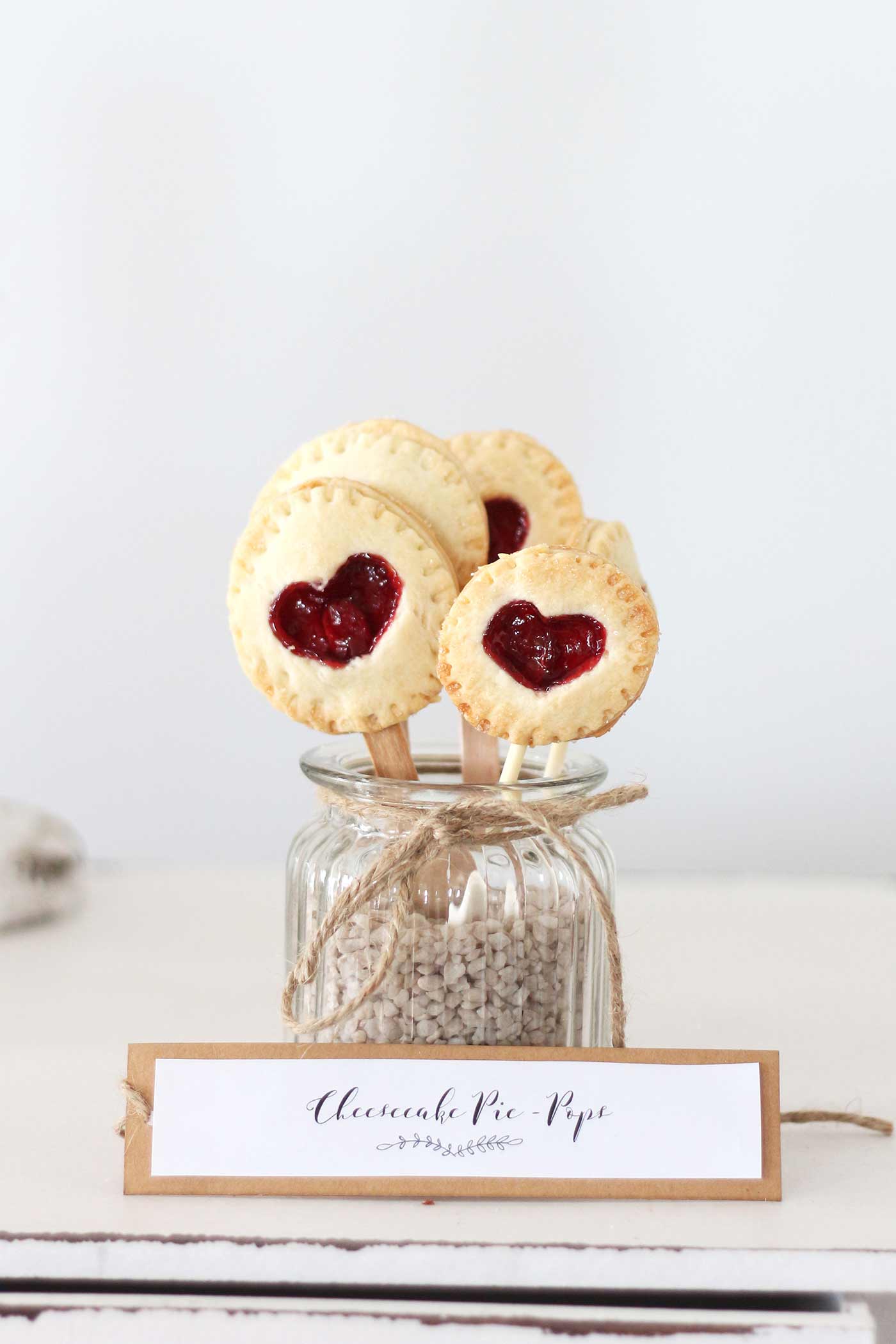 Den Backofen auf 180 °C (Ober-/Unterhitze) vorheizen. Für die Füllung den Frischkäse mit dem Zucker in einer Schüssel gut verrühren. Den Teig nach Packungsanleitung ausrollen und mit einem runden Ausstecher Kreise ausstechen. In die Hälfte der Kreise kleine Herzchen stechen oder mit einem Messer kreuzförmig einschneiden. Die Hälfte der Teigkreise auf ein mit Backpapier ausgelegtes Backblech legen. Das Ei verquirlen und die Teigkreise damit bepinseln. Nun je einen Lolli-Stick bis zur Kreismitte auf den Kreis legen und leicht andrücken. Je einen Klecks Frischkäse und einen Klecks Marmelade auf den Kreisen verteilen (nicht zu viel, sonst läuft die Masse beim Backen aus den Pie-Pops).  Darauf achten, dass noch ein Rand übrig bleibt, da sonst die Pies nicht richtig zugemacht werden können. Nun die übrigen Teighälften auf die Kreise legen und am Rand mit einer Kuchengabel gut zusammendrücken. Zum Schluss die Oberfläche mit dem verquirlten Ei bepinseln und mit etwas Zucker bestreuen. Die Pie-Pops im vorgeheizten Backofen etwa 15 Minuten goldbraun backen und abkühlen lassen.