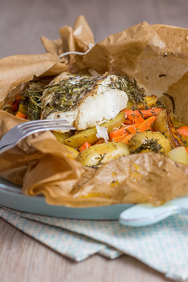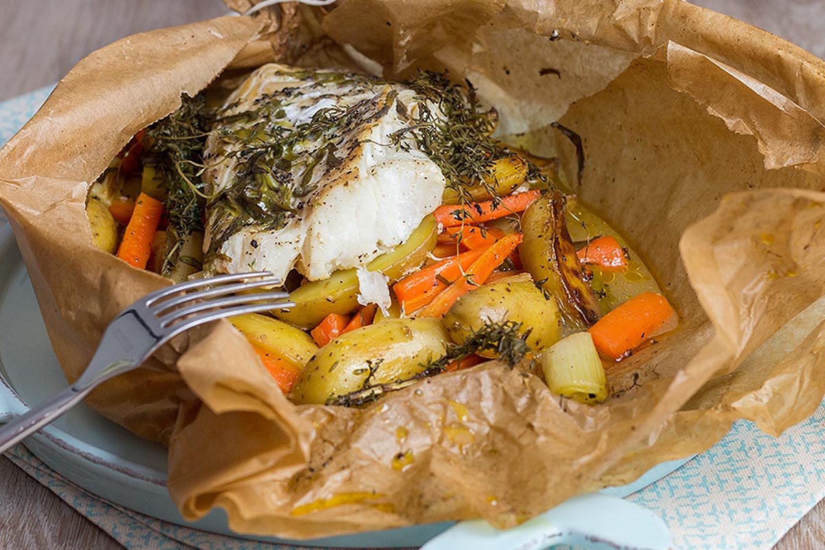 Kartoffeln gründlich abbürsten, waschen und vierteln. Perfekt eignen sich kleine Drillinge. Karotten schälen und in dünne Stifte schneiden. Frühlingszwiebeln putzen, waschen und in ca. 2 cm lange Stücke schneiden. Olivenöl in einer großen Pfanne erhitzen und die Kartoffeln sowie die Karotten ca. 3 Minuten unter Rühren andünsten. Dann die Frühlingszwiebeln dazugeben und weitere 2 Minuten mitdünsten. Mit Salz, Pfeffer, 1 Prise Zucker und einem Spritzer Zitronensaft würzen. Nun jeweils 2 Blätter Backpapier (ca. 40 x 38 cm groß) übereinanderlegen und das Gemüse mittig darauf verteilen. Die Kabeljaufilets waschen, trocken tupfen und von beiden Seiten mit Salz und Pfeffer würzen. Auf das Gemüsebett geben und mit jeweils 1 TL Zitronensaft beträufeln. Die Blätter von den Estragonstielen abzupfen und zusammen mit den Thymianstielen zu dem Fisch und dem Gemüse geben. Zum Schluss jeweils 1 TL Butter auf die Filets geben. Die Päckchen gut über dem Fisch zusammenfalten und an den Enden mit Küchengarn zubinden. Bei 200 Grad Ober- und Unterhitze auf der mittleren Schiene ca. 25 – 35 Minuten garen, bis die Kartoffeln gar nicht.