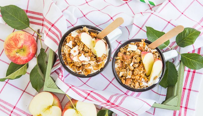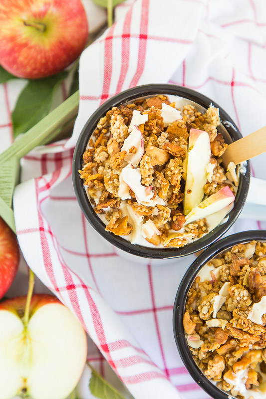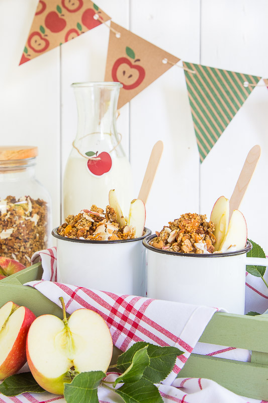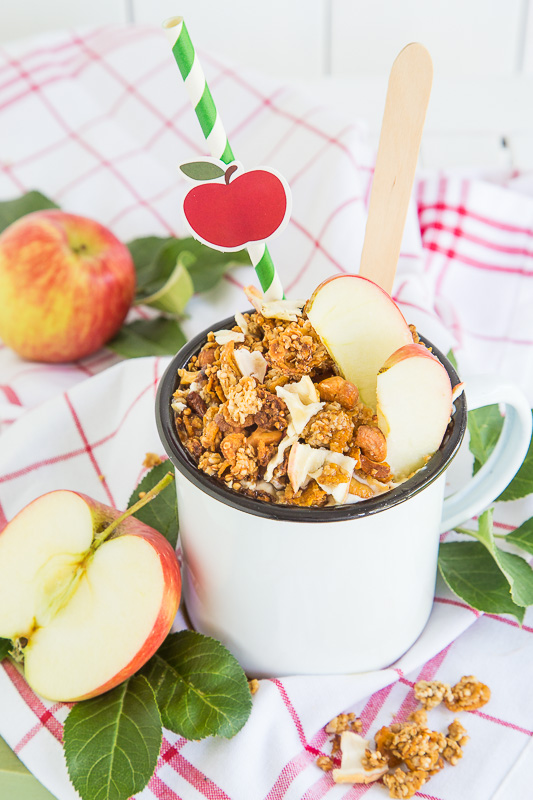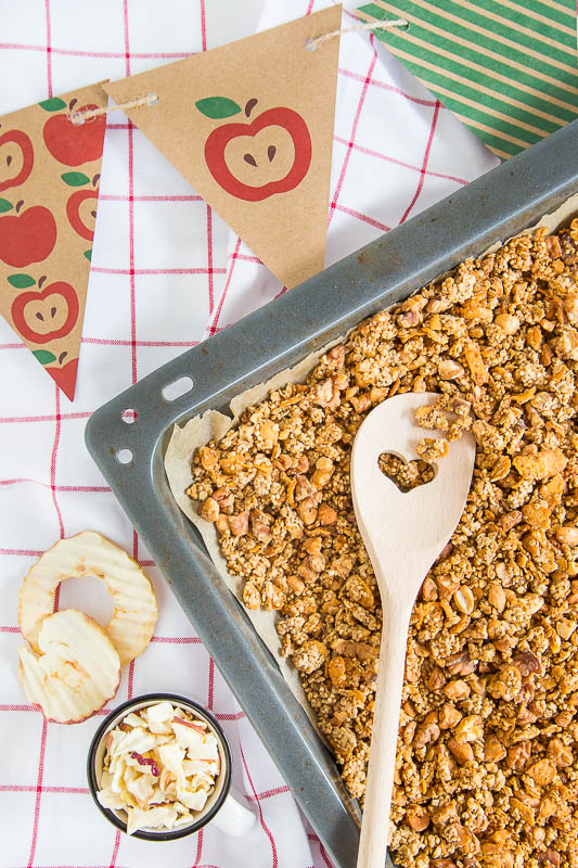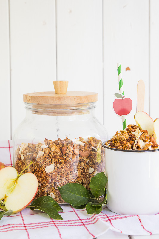 So ein knuspriges Granola mit Äpfeln und Nüssen selbst zu machen, ist eine gute Alternative zu den gesüßten Müslis im Handel. Da wir aktuell mitten in der Apfelzeit sind und es etwas deftiger auf dem Tisch wird, mag ich die Kombination aus Äpfeln und Walnüssen sehr. Dieses Granola ist sehr einfach gemacht und glaubt mir, habt ihr einmal solch ein Crunchy Müsli selbst gemacht, wollt ihr nichts anderes mehr zum Frühstück haben.