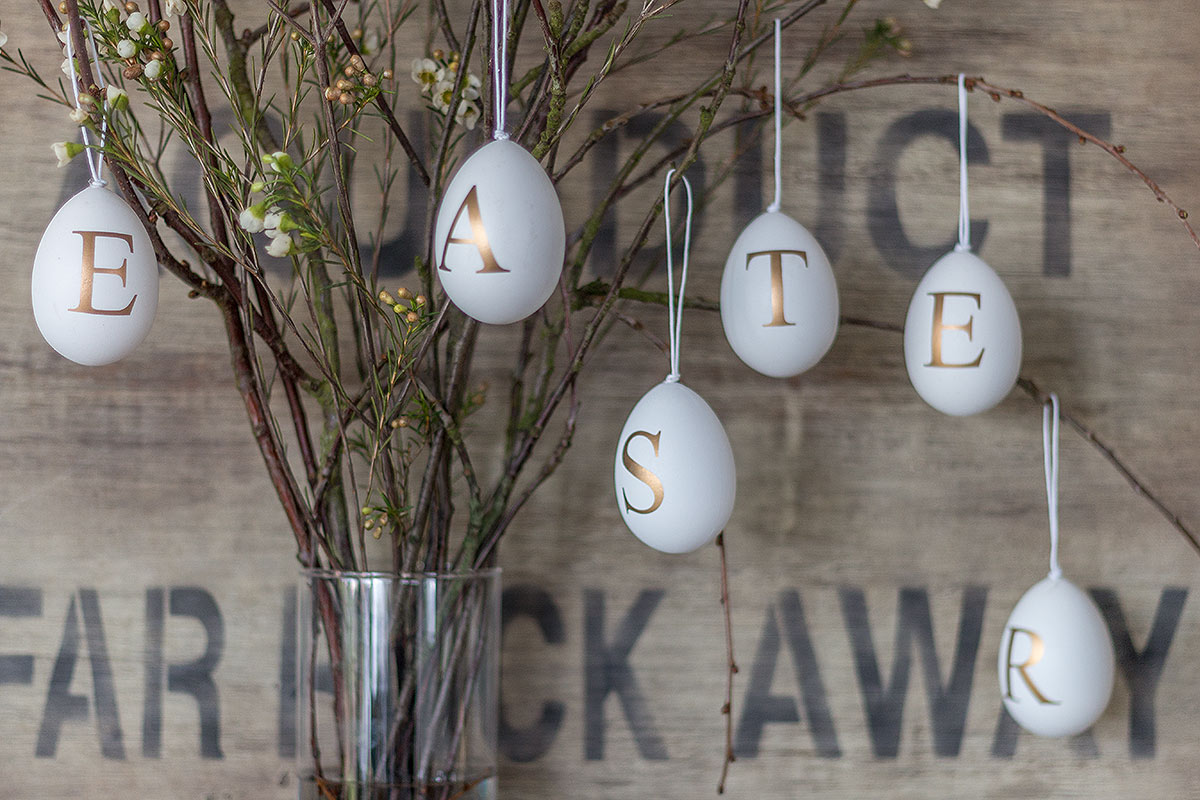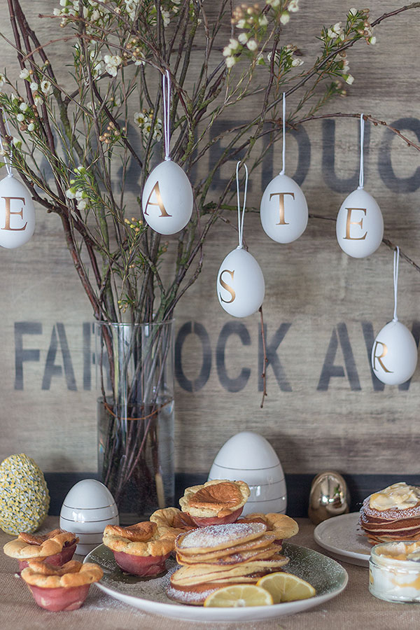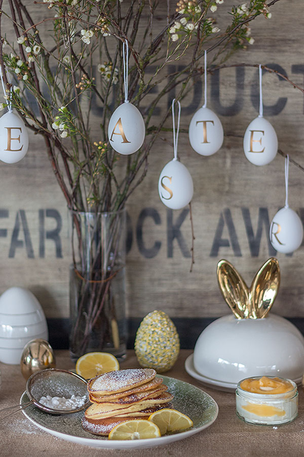 Unter der Servierhaube Hasenohr werden die Pancakes zum Hingucker und halten sogar noch warm. Zwei Fliegen mit einer Klappe. Aber auch auf dem grünen Teller kann man sie toll servieren. Besonders schön sieht es aus, wenn man den Puderzucker noch etwas weiter über die Pancakes streut, sodass auch der Teller damit bedeckt ist. Was auf dem Ostertisch nicht fehlen darf, sind Zweige mit Ostereier-Anhängern. Ich finde diese hier mit der goldenen Schrift ganz bezaubernd. Die Zweige einfach in eine Vase mit Wasser geben. Toll dazu machen sich auch die Deko Ostereier mit goldenen Streifen. Diese gibt es auch noch in klein oder in Gold.