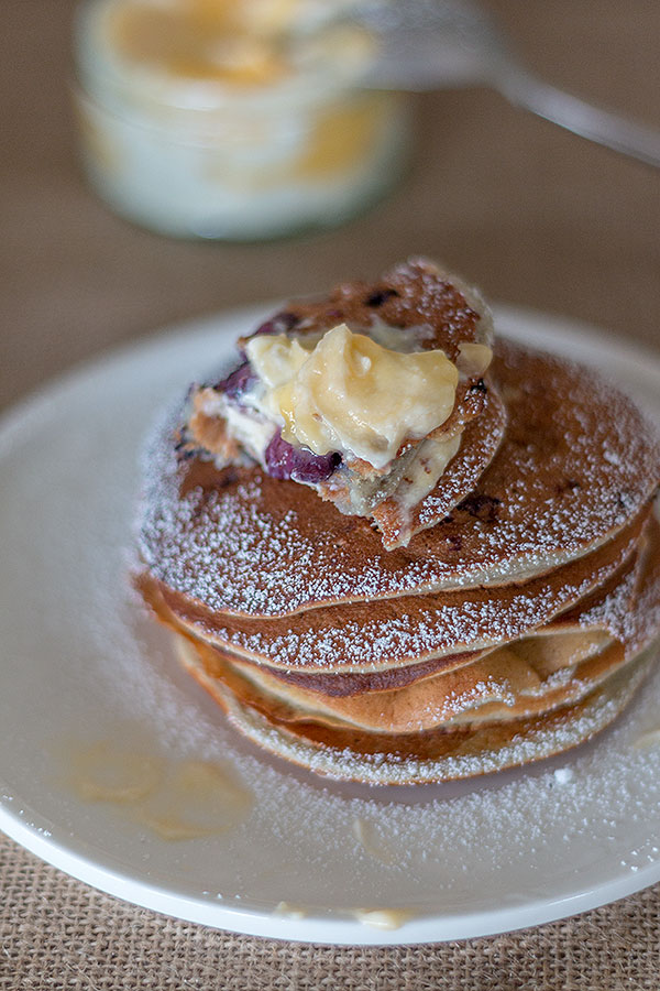 Blaubeer Pancakes mit der Ricotta-Lemon-Curd-Creme servieren.
