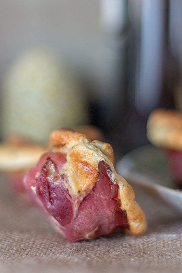 Backofen auf 200° Grad Ober- und Unterhitze vorheizen. Die Butter in einem Topf bei mittlerer Hitze schmelzen lassen. Das Mehl hinzufügen und ca. 1 Minute anschwitzen. Die Milch nach und nach unter Rühren hinzufügen und 5 – 6 Minuten köcheln lassen. Dabei immer weiter rühren, bis eine dickflüssige Masse entsteht. Den Topf vom Herd nehmen und Ricotta, Parmesan, Gruyère, 4 Eigelbe und den Dijonsenf dazugeben. Alles gut miteinander verrühren und mit Salz und Pfeffer abschmecken. Die 5 Eiweiße mit dem Mixer steif schlagen. Ein Drittel des Eischnees vorsichtig unter die Masse heben. Dann den restlichen Eischnee dazugeben und ebenfalls vorsichtig unterheben. 12 Muffinförmchen mit etwas Butter einfetten und diese mit jeweils 2 Scheiben Rohschinken auslegen. Die Soufflémasse draufgeben und im Backofen ca. 10 – 15 Minuten backen, bis die Mini-Käse-Soufflés aufgehen und sich goldbraun färben.
