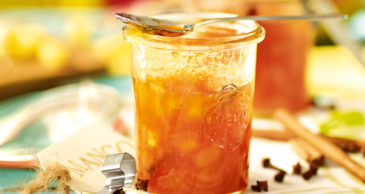 Das Chutney kann man gut in Einmachgläsern einige Wochen im Kühlschrank aufbewahren und ist zugleich auch eine schöne Deko-Idee für den gedeckten Tisch.