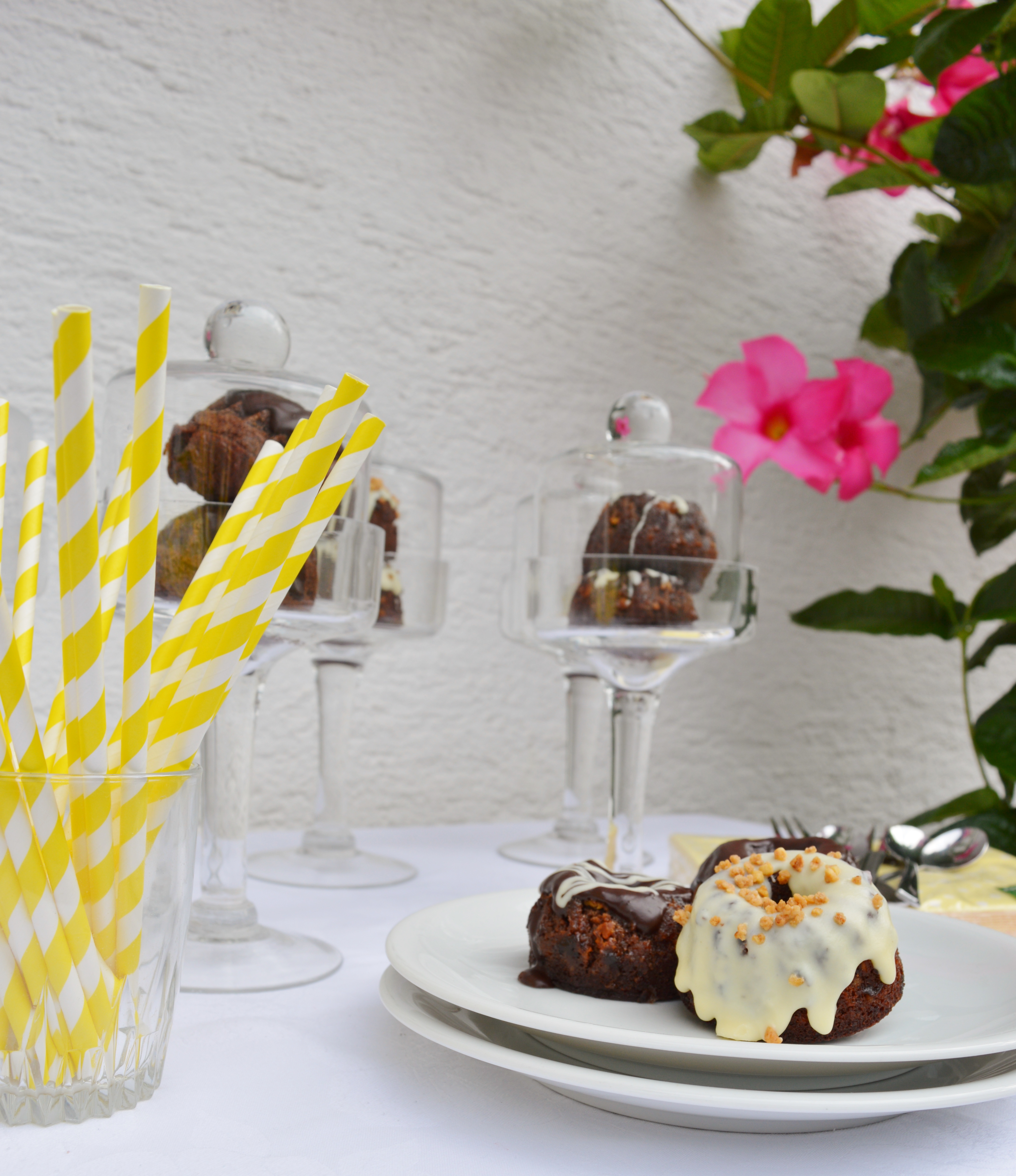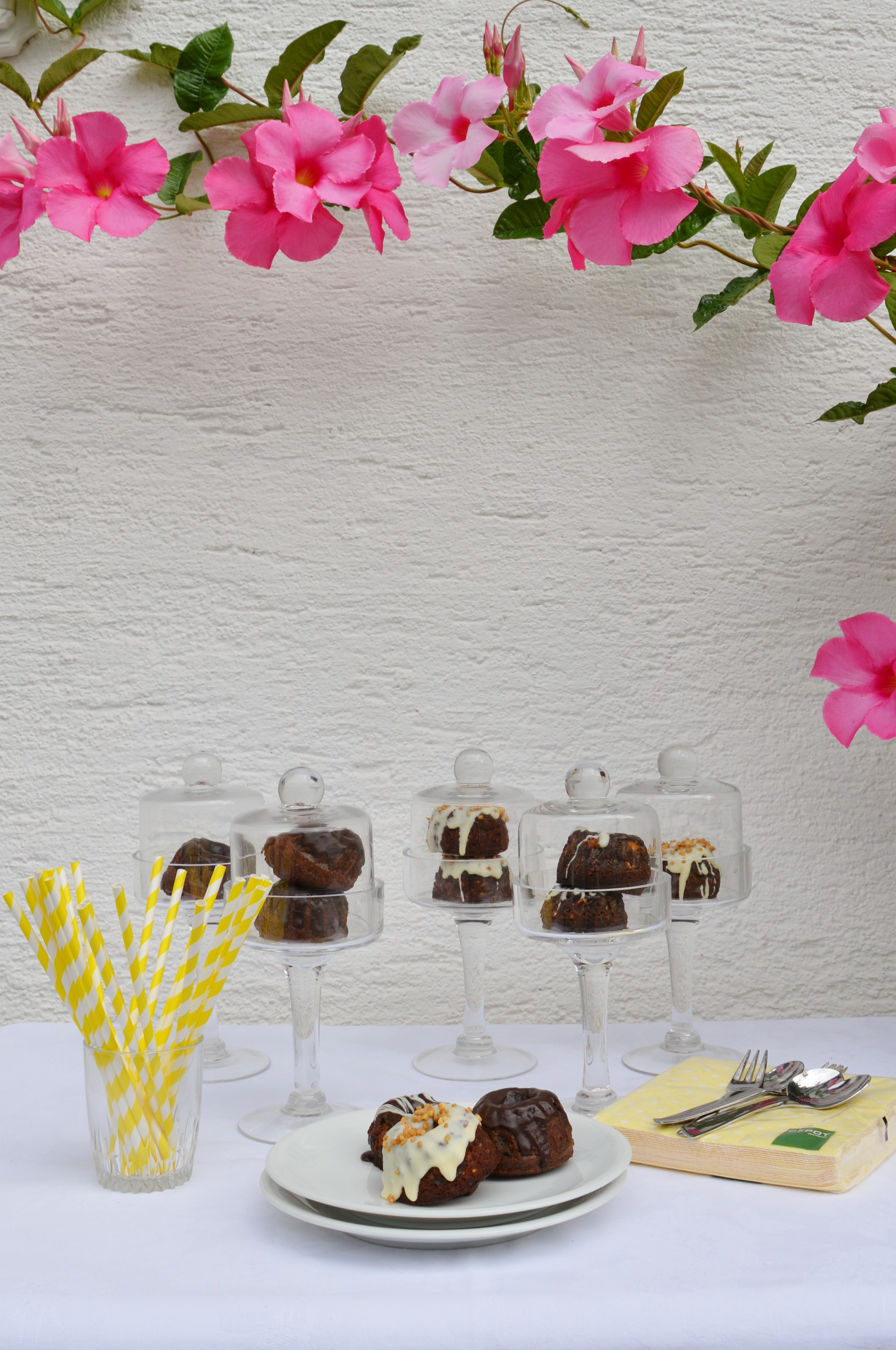 Der Garten ist hübsch dekoriert, das leckere Essen vorbereitet, der Sekt ist kalt gestellt und die Gäste sind im Anmarsch…Die Garten-Party kann beginnen! Leider kommen meist nicht nur geladene Gäste, sondern auch ungebetene: Wespen! Heute will ich euch zeigen, wie die lästigen Tierchen keine Chance haben, Eure feinen Leckereien anzuknabbern und die Gäste zu belästigen. Traumhafte Etageren mit Glasglocken sehen nicht nur wundervoll aus, sondern halten jegliches Ungeziefer vom Essen fern! Ich habe es mit süßen Mini-Napfkuchen getestet und liefere den Beweis: Keine Wespen weit und breit! Dabei war die Verlockung sooo groß. Es gibt heute nämlich ein besonders süßes Rezept für Euch: Dreierlei Mini-Napfkuchen mit dunkler Schokolade, weißer Schokolade und Nüssen!