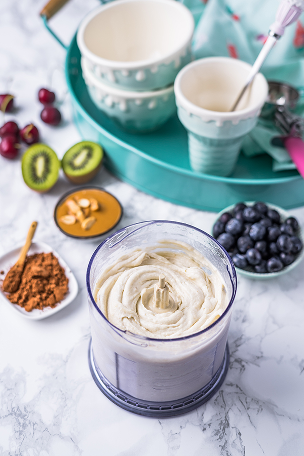 Die Banane macht diese Eiscreme übrigens so richtig schön cremig, weil sie wenig Wasser enthält. Außerdem ist sie so süß, dass es keine zusätzlichen Süßungsmittel braucht. Dafür aber immer darauf achten, dass die Banane schön reif ist. Wenn sich viele kleine braune Pünktchen auf der Schale befinden, ist sie perfekt und bereit für das Gefrierfach.