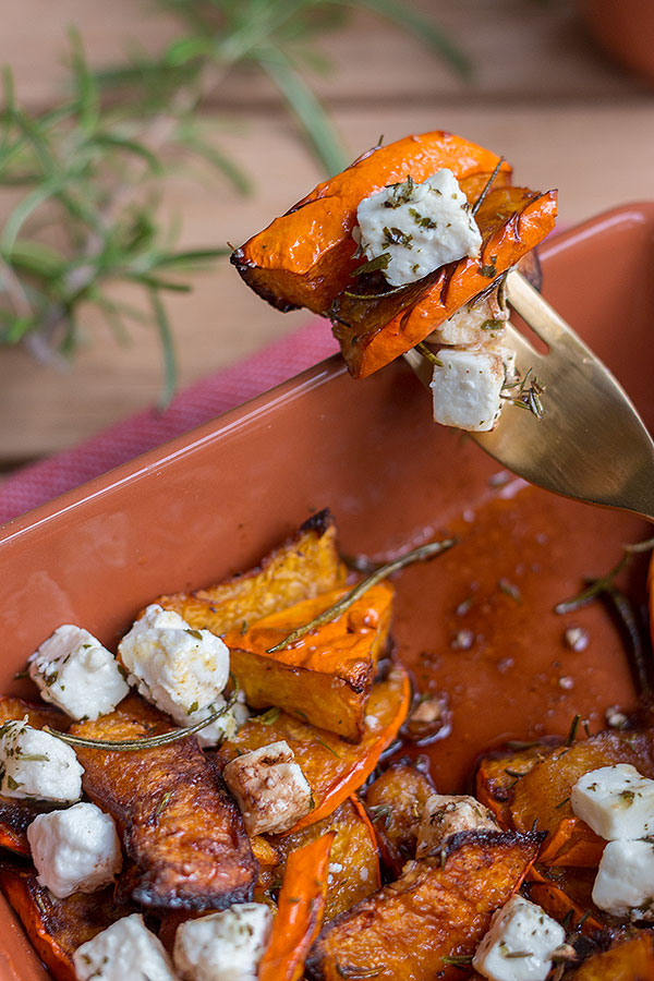 Backofen auf 200 Grad Umluft vorheizen. Hokkaido Kürbis waschen, entkernen und in mundgerechte Stücke schneiden. Auf ein mit Backpapier ausgelegtes Backblech geben, das Olivenöl zum Kürbis geben und alles miteinander vermengen. Mit Salz und Cayennepfeffer würzen. Rosmarin & Thymian waschen, trocken schütteln und von den Zweigen trennen. Für 30 Minuten in den Backofen geben. Danach den Feta auf dem Kürbis verteilen. Honig und Balsamico darüber geben und nochmals für ca. 5 – 10 Minuten in den Ofen schieben. Dazu passt hervorragend frisches Baguette mit Knoblauchdip.