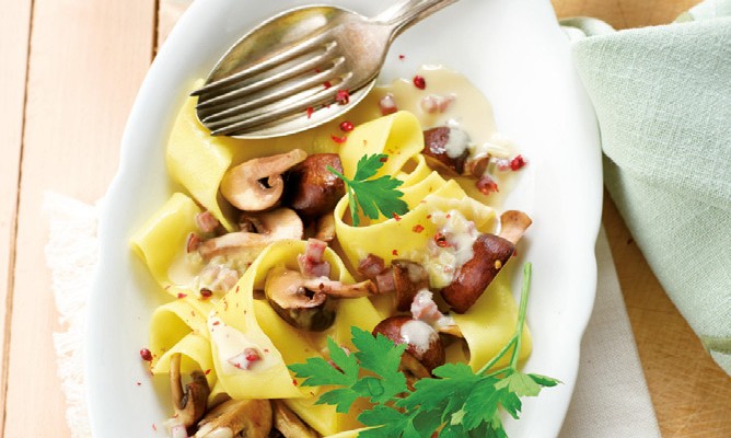 Würzig und mit Pfiff. Parpadelle mit leckerem Speck und Pilzen ist leicht zuzubereiten und schmeckt jedem, der Pilze mag