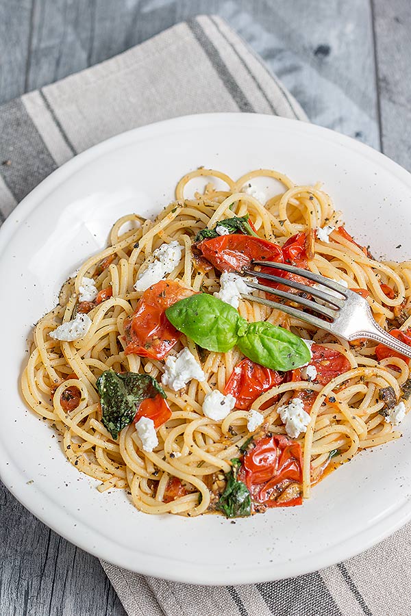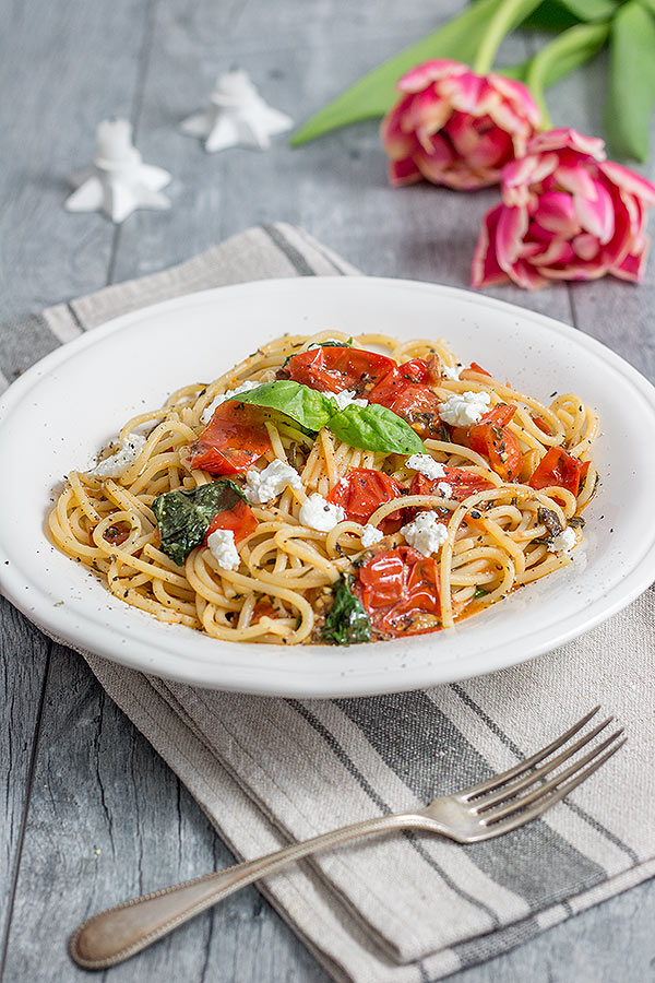 - Pasta mit Kräuter-Knoblauch-Öl, Tomaten und Ziegenkäse