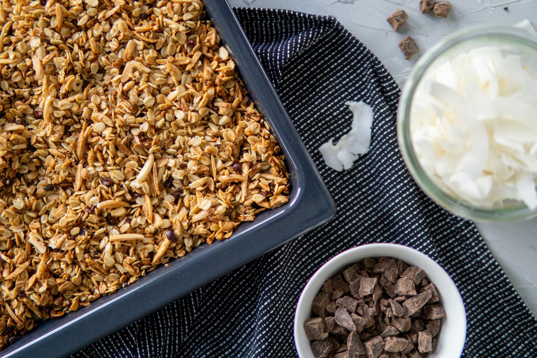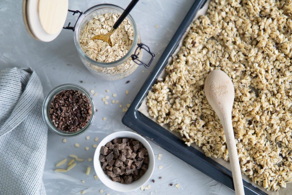 5. Hat das Granola die richtige „Bräune“, kann es aus dem Backofen genommen werde. Bevor Ihr es mit den Schokostückchen vermischt, sollte das Granola komplett abgekühlt sein.