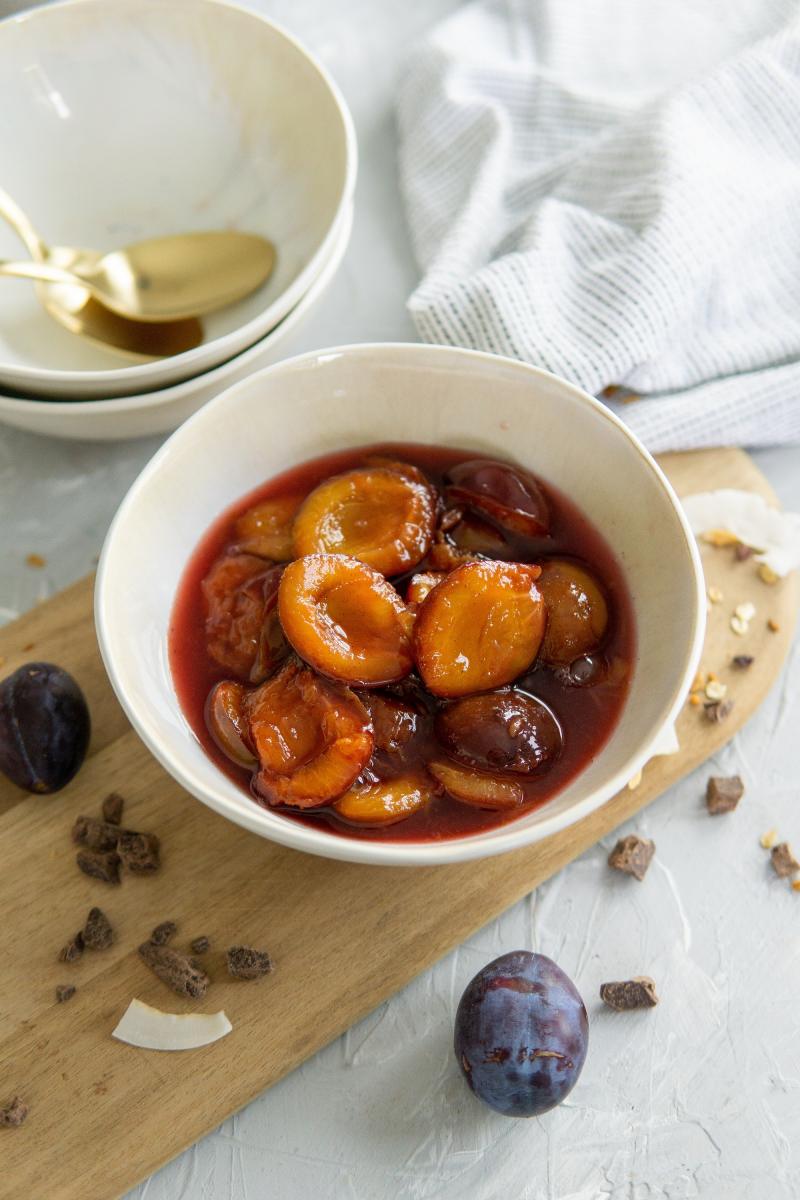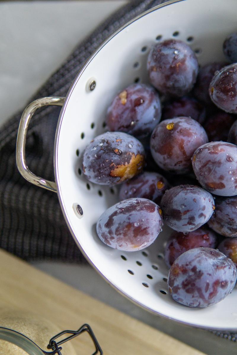 1. Zuerst die Pflaumen gründlich waschen, halbieren und entkernen.