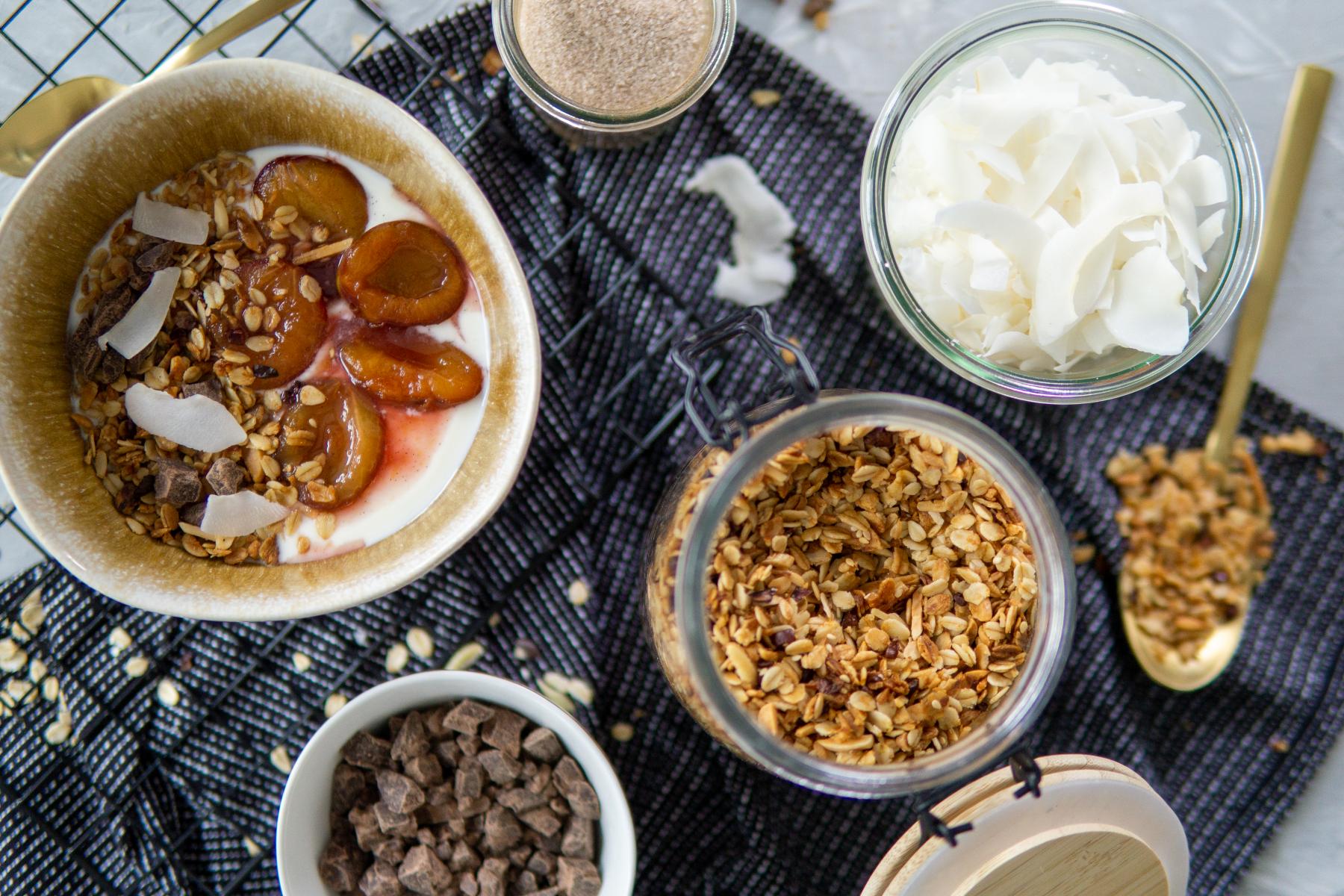 Der Backofen wird auf 175 Grad Celsius vorgeheizt und das Backblech  für 25-30 min auf die mittlere Schiene geschoben. Wenn kleine Bläschen in den Gläsern aufsteigen sind die Gläser fertig. Wer gleich nach dem Ausmachen den Backofen öffnet, sollte aufpassen, weil der Wasserdampf ziemlich heiß ist. Eingekochte Pflaumen sind mindestens sechs Monate haltbar. Dieser Pflaumenkompott eignet sich super als Topping. Ob zu Milchreis, Grießbei oder zum Naturjoghurt bleibt dabei jedem selbst überlassen. Meine liebste Variante verrate ich Euch natürlich auch. Aber wer den Text gelesen hat, wird schon erahnen, dass ich mein Pflaumenkompott am liebsten mit Naturjoghurt und Granola genieße. Für das Granola benötigt Ihr nicht viel. Die Grundlage stellen kernige Haferflocken, Ahornsirup sowie Kokosfett da, die restlichen Zutaten könnt Ihr nach Herzenswunsch variieren. Folgende Zutaten wären für das Knuspermüsli denkbar: Sesam, Mandelstifte, Nüsse allgemein, Kakaonibs, getrocknete Früchte, Schokoladenstückchen, Kokosraspeln und, und, und…