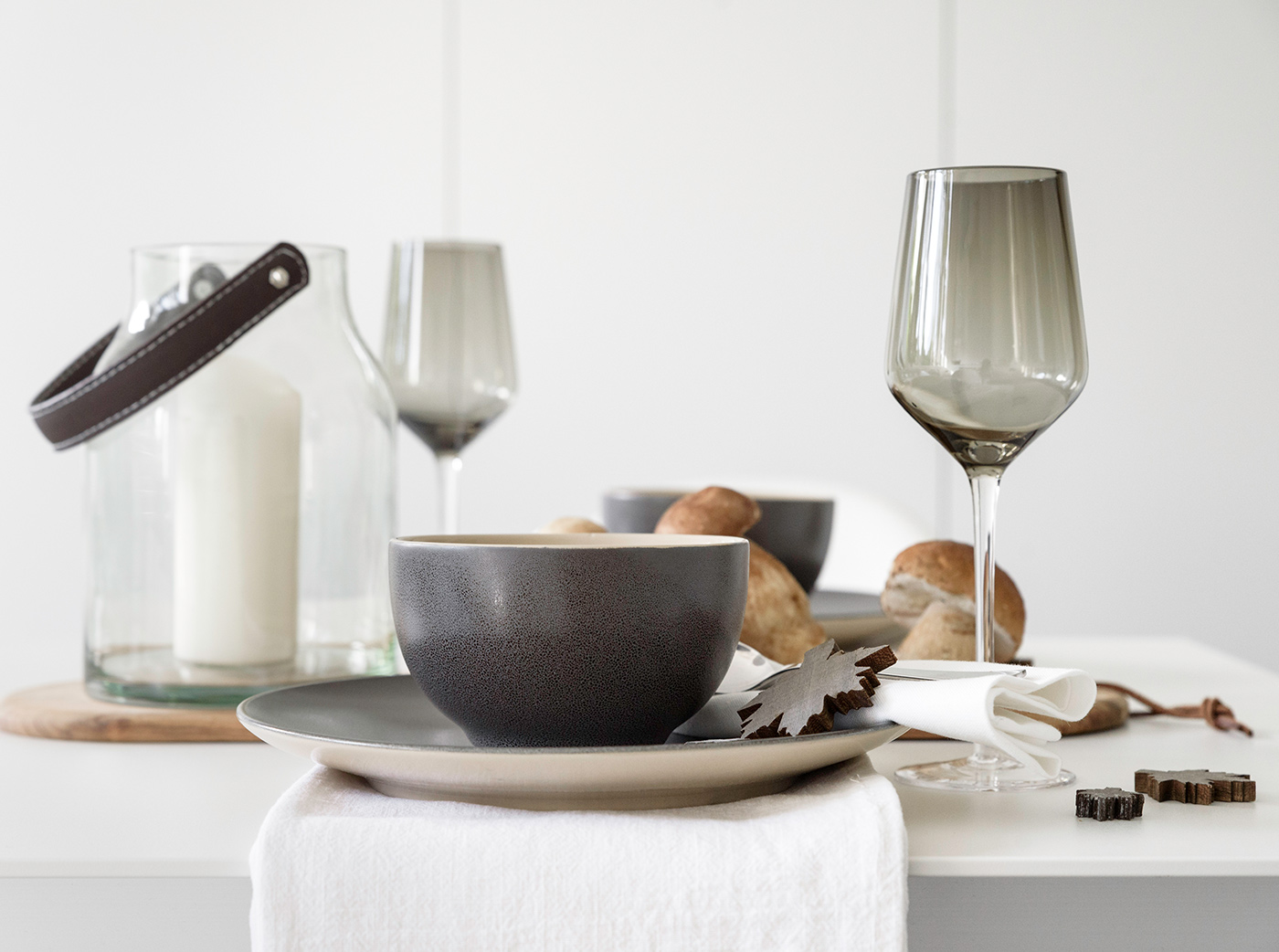 - Kerzen bringen ein stimmungsvolles Licht auf den Tisch, hier brennt eine in einem Windlicht aus Glas.
