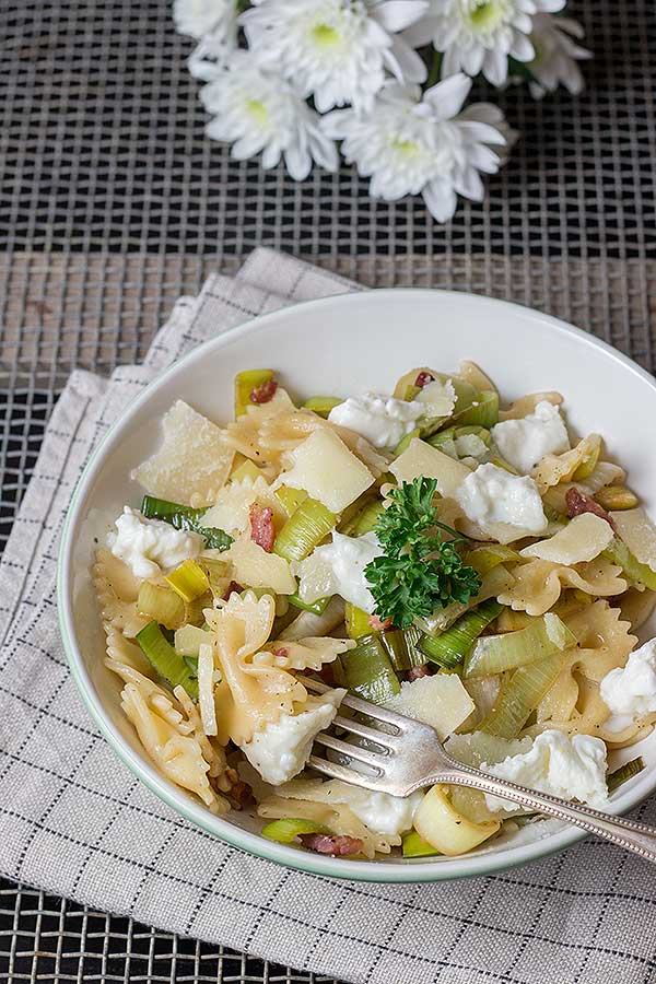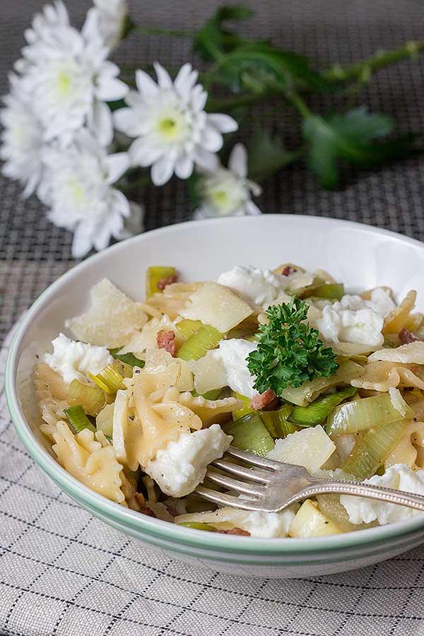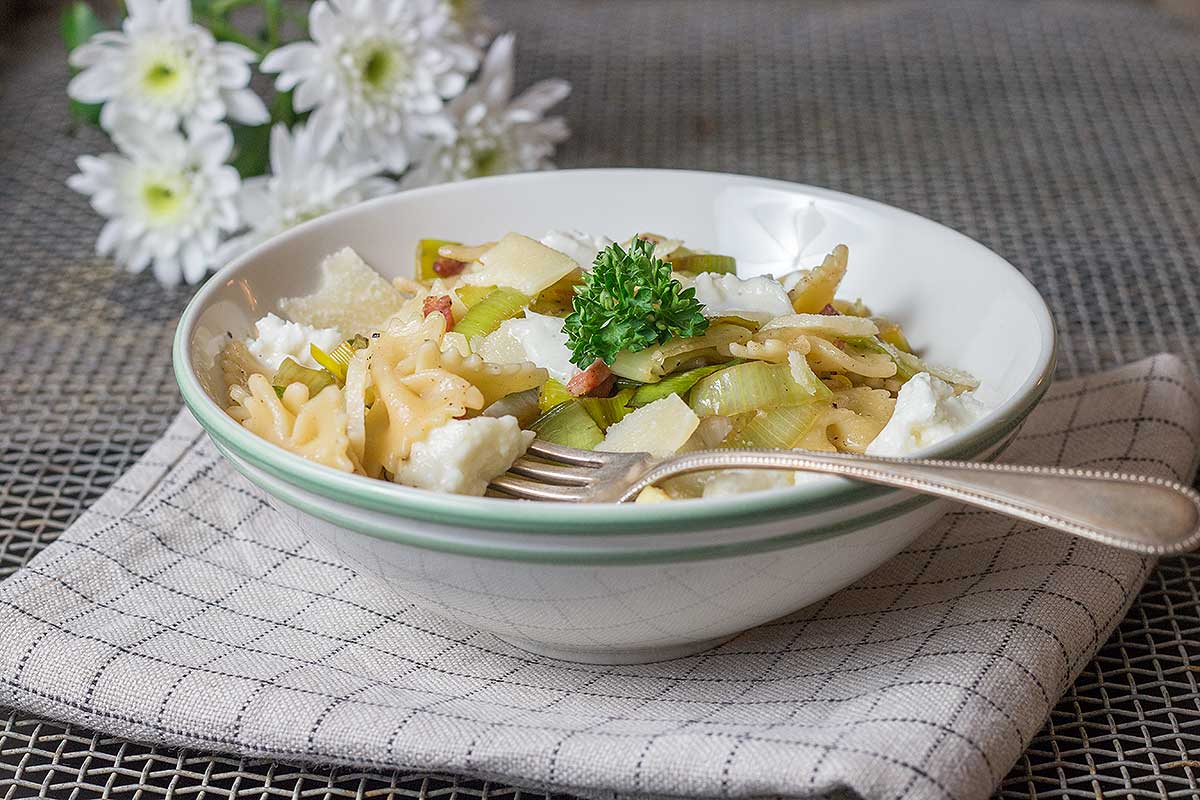 Habt ihr abends nach der Arbeit auch manchmal keine Lust etwas Aufwendiges zu kochen? Oder seid ihr, wie wir gerade, im Umzugsstress? Dann passt diese schnelle Pasta mit Lauch, Ricotta und Speck perfekt! In 25 Minuten steht dieses Gericht auf dem Tisch. Und schmeckt dazu noch sehr lecker. Der Speck gibt dieser Pasta eine tolle Würze und der cremige Ricotta zerschmilzt förmlich auf der Zunge.