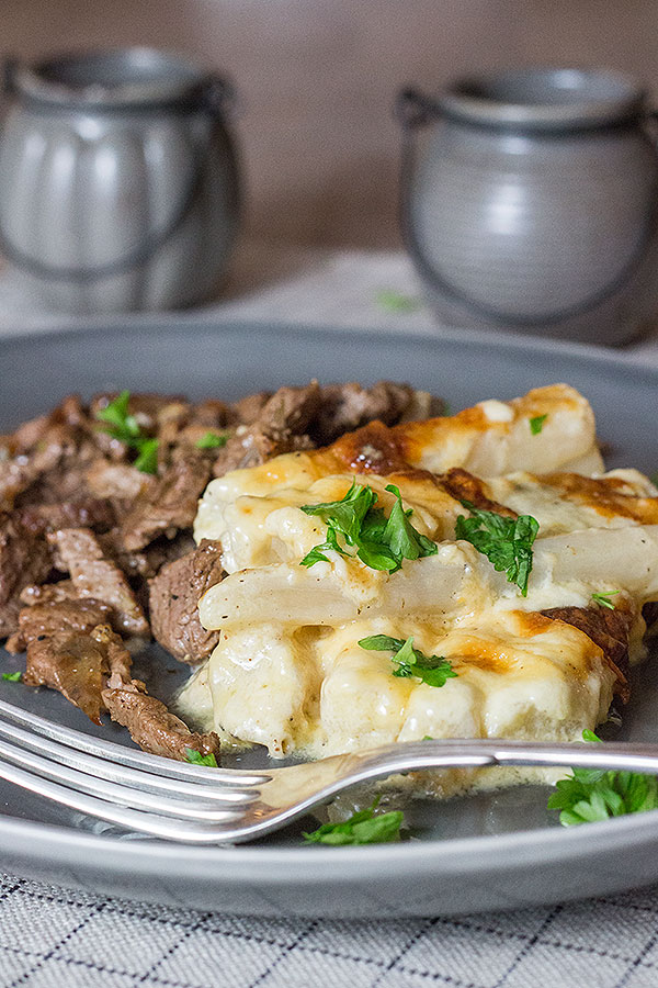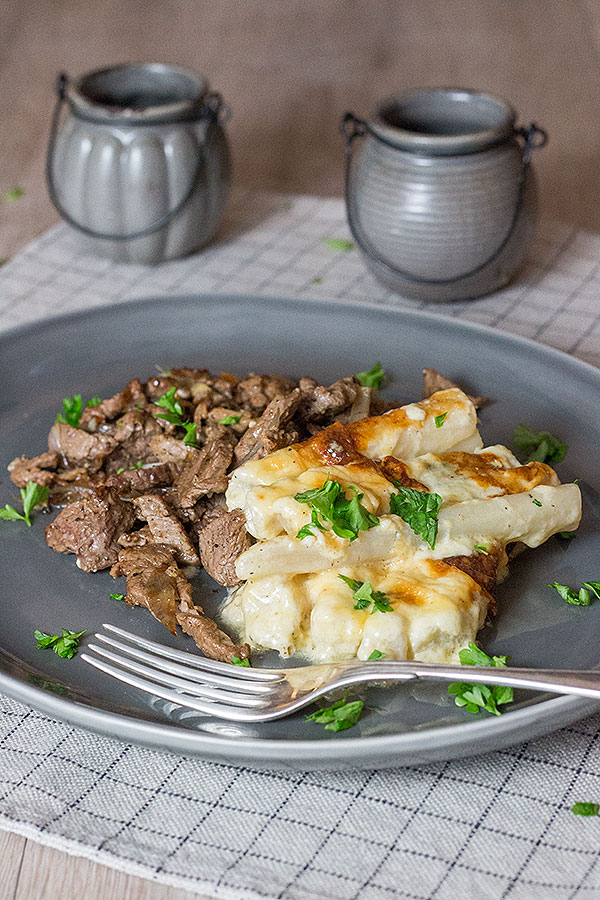- Schwarzwurzelgratin mit Rinderfiletstreifen