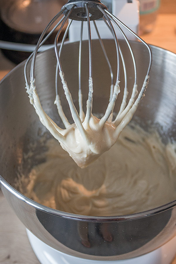 - Nach und nach in dünnem Strahl das Öl einfließen lassen und auf hoher Stufe verschlagen lassen, bis eine homogene Masse entstanden ist.