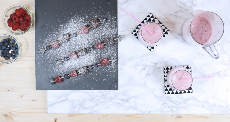 Ich verarbeite fast alles an Gemüse und Frucht aus dem Garten oder aus dem Kühlschrank und mixe es zu einem leckeren Smoothie zusammen. Wer seine Smoothies selbermacht, der weiß auch gleich was drin ist, denn im Supermarkt finden sich oft versteckte Zuckerfallen. Smoothies kommen übrigens ursprünglich aus Amerika und bedeuten „fein“ und „cremig“. Aufgepeppt mit etwas Milch oder Wasser lassen sich die kreativsten Drinks mixen. Ich habe meinen Favoriten für diesen Sommer bereits gefunden: Ein Himbeer- Heidelbeere Smoothie. Und weil ein Smoothie alleine langweilig ist, hab ich mir ein paar Fruchtspieße mit Brownies dazu gezaubert.
