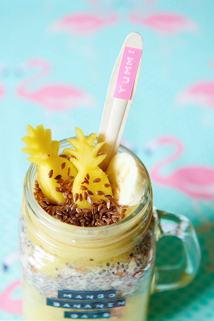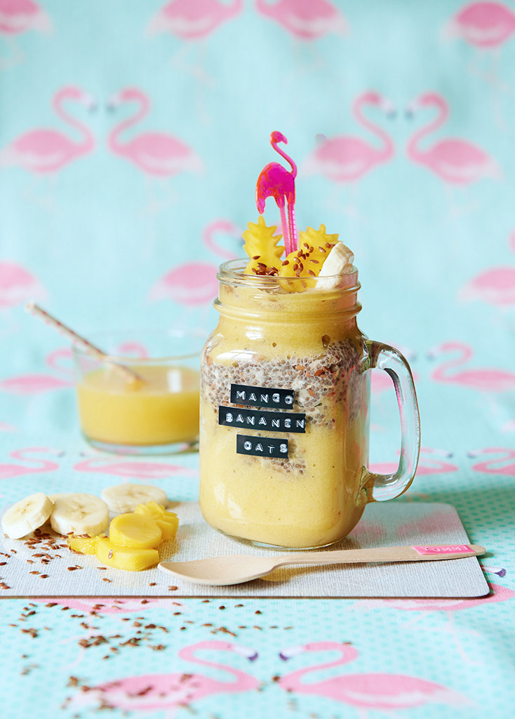 Die Gläser werden jetzt mit dem Mango- und Bananenpüree und der Hafterflockenmischung Schicht für Schicht gefüllt, bis sie voll sind. Ja ich weiß, es sieht echt verdammt lecker aus, aber das Ganze muss jetzt noch für mindestens zwei Stunden oder am besten über Nacht in den Kühlschrank und gut durchziehen.