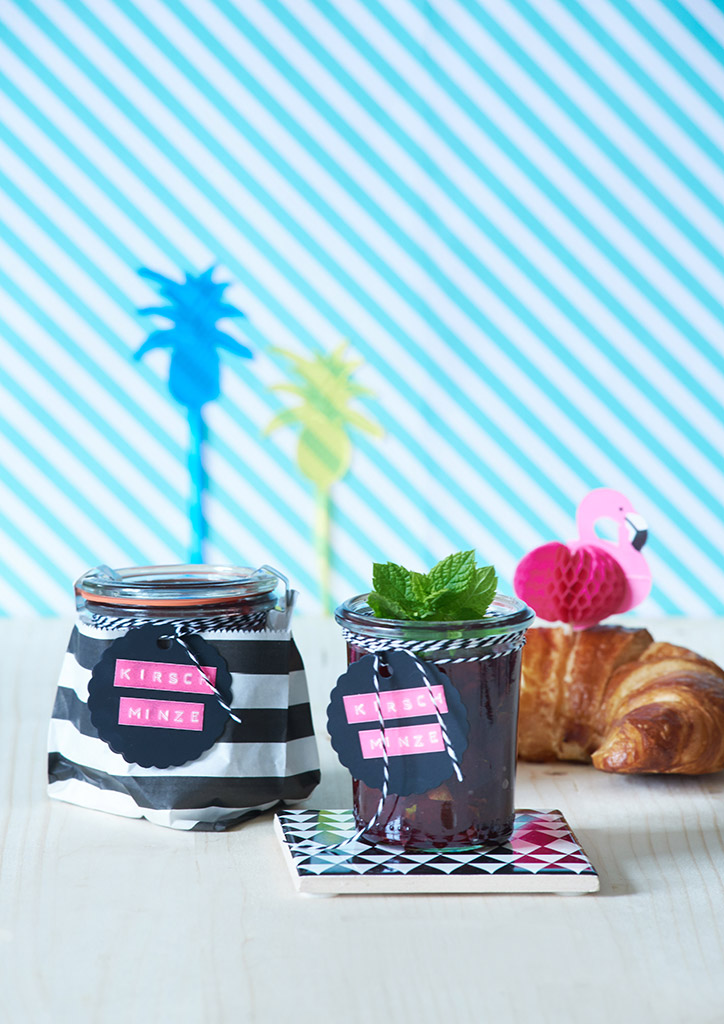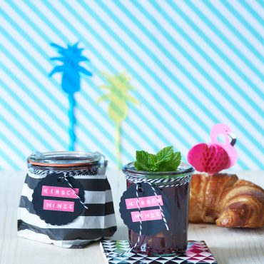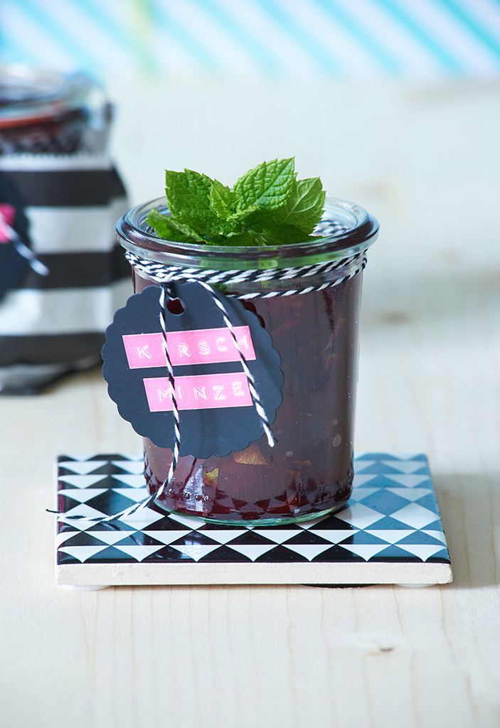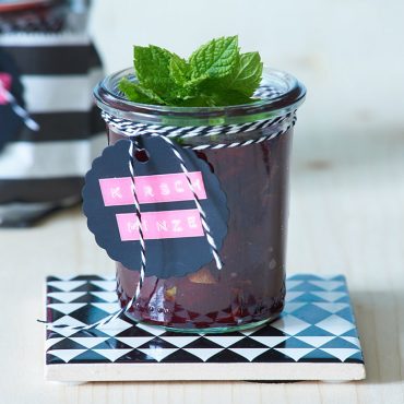 Damit auch jeder weiß was drin ist, fehlt nur noch ein tolles Label. Dafür den Namen „Kirsch Minze“ mit dem Labelmaker ausstanzen und auf den Etikettenanhänger kleben. Schnell noch das Band zuschneiden, ein paar mal um das Glas wickeln und den Anhänger daran befestigen. Wer die Marmelade verschenken möchte, kann diese auch in gemusterte Papiertütchen stecken
