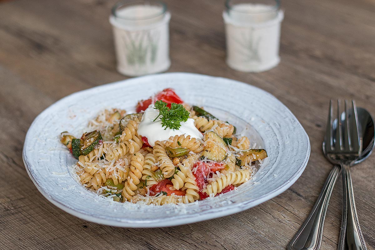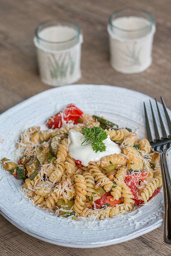 - sommerliche Pasta mit Zucchini, Tomaten und Pinienkernen