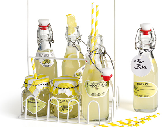 Damit Eure Gäste ihre Flaschen oder Trinkgläser nicht verwechseln, könnt Ihr sie mit einem Namensschildchen verzieren. Ein zusätzlicher Hingucker sind „Handmade“- Aufkleber. So wird die Limonade zum wunderbaren (Gast)geschenk. Oder Ihr bastelt ein Namens-Fähnchen. Dafür einfach Deko-Tape um den Trinkhalm kleben und Namen darauf schreiben.